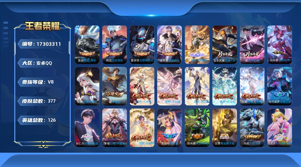 [17303311]【特价出售/店主推荐】1.3w小国王昭君、万战金标不知火舞、6市标、对抗路30段、发育路30段,安卓Q-V8-尊贵铂金I段位-126英雄-377皮肤-4典藏皮肤-1无双-2珍品传说-2星传说-25传说-122史诗
