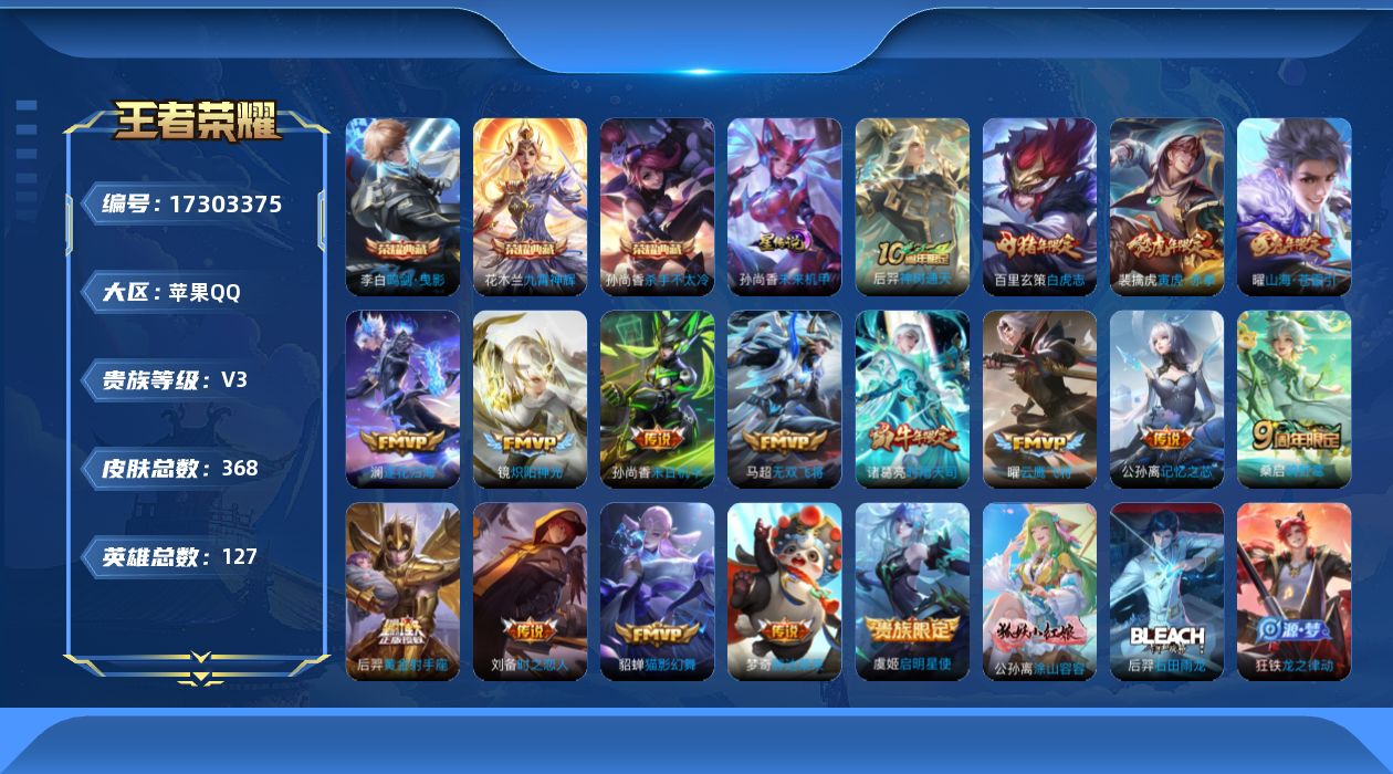 [17303375]【特价急出/详情看图】苹果Q-V3-最强王者段位-127英雄-368皮肤-3典藏皮肤-1星元-17传说-114史诗