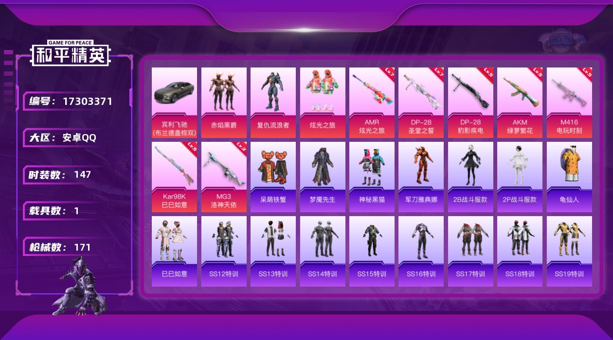 [17303371]【特价出售/店主推荐】安卓 手Q-3粉装-9特效枪-1载具-0粉色飞行器-55344热力值-5王牌印记-147套装-171枪皮