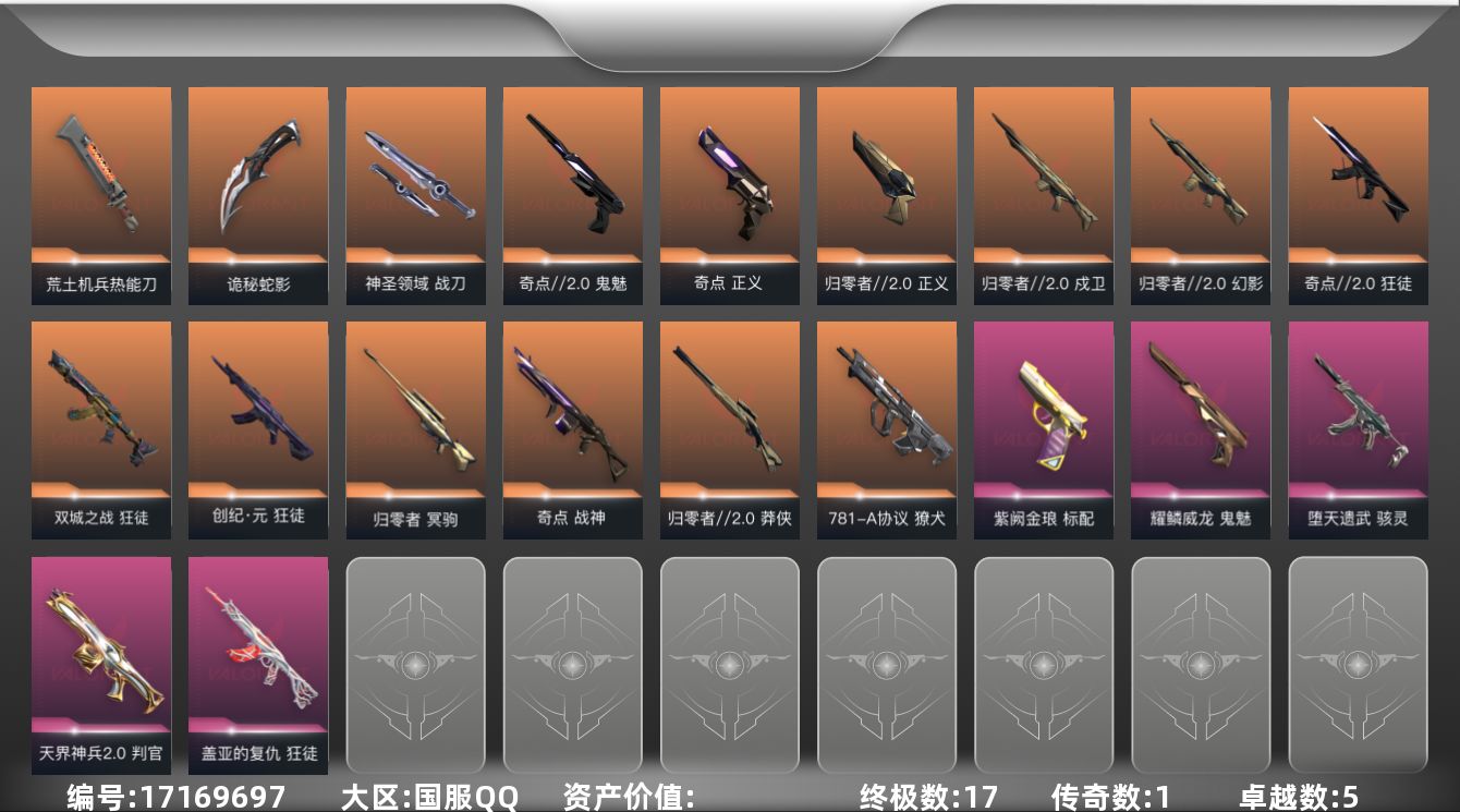 [17169697]【近战武器】:近战武器-荒土机兵 热能刀,近战武器-生物分子解离器,近战武器-夜刃诡镰,近战武器-诡秘蛇影 军刀,近战武器-神圣领域 战刀 【狂徒】:狂徒-奇点//2.0,狂徒-双城之战,狂徒-创·纪元,狂徒-盖亚的复仇,狂徒-荒土机兵,狂徒-诡秘蛇影 【幻影】:幻影-归零者//2.0,幻影-神圣领域,幻影-纳米打击,幻影-末日之翼 【戍卫】:戍卫-归零者//2.0,戍卫-逆冲蛮牛,戍卫-月球哨兵,戍卫-折光棱晶 【獠犬】:獠犬-781-A协议,獠犬-神圣领域,獠犬-逆冲蛮牛 【冥驹】:冥驹-归零者,冥驹-荒土机兵,冥驹-星云暗涌 【飞将】:飞将-末日之翼 【莽侠】:莽侠-归零者//2.0,莽侠-诡秘蛇影,莽侠-月球哨兵 【战神】:战神-奇点,战神-神圣领域 【奥丁】:奥丁-纳米打击,奥丁-末日之翼 【判官】:判官-天界神兵//2.0,判官-诡秘蛇影,判官-纳米打击x 【雄鹿】:雄鹿-逆冲蛮牛,雄鹿-月球哨兵 【骇灵】:骇灵-堕天遗武,骇灵-荒土机兵,骇灵-星云暗涌 【蜂刺】:蜂刺-星云暗涌,蜂刺-折光棱晶 【标配】:标配-紫阙金琅,标配-荒土机兵,标配-折光棱晶 【正义】:正义-归零者//2.0,正义-奇点,正义-超限闪存,正义-纳米打击,正义-月球哨兵 【鬼魅】:鬼魅-奇点//2.0,鬼魅-耀鳞威龙,鬼魅-诡秘蛇影,鬼魅-星云暗涌 【狂怒】:狂怒-神圣领域,狂怒-逆冲蛮牛 【短炮】:短炮-梦魇恶魔,短炮-末日之翼 【卡面】:终章:激斗汉堡 卡面,进入射程 卡面,分崩离析 卡面,纳米打击 卡面,抑制技术 卡面,激斗汉堡 卡面,瓦娃脸雪糕 P2 卡面,从黄昏到黎明 卡面,荒土机兵 卡面,银弹猎手 卡面,逆冲蛮牛 卡面,《双城之战》拥抱 卡面,精灵大战 卡面,欢迎来到底城 卡面,南瓜盛典 卡面,修车达人 卡面,正义的化身 卡面,无畏契约GO!第一卷:芮娜 卡面,无畏契约GO!第一卷:零 卡面,比比看谁快? 卡面,代号红色 卡面,新兵报到 卡面,V契约 卡面,无畏契约 卡面,暗潮 卡面 【喷漆】:小小心意 喷漆,战“素”兔 喷漆,宇宙的指引 喷漆,请求重启 喷漆,逆冲蛮牛 喷漆,纳米打击 喷漆,鼻尖上的蝴蝶 喷漆,简笔画黯兽 喷漆,独守蝰腹 喷漆,他们将落荒而逃 喷漆,通缉:战术企鹅 喷漆,荒土机兵 喷漆,别挡我吃球! 喷漆,嗨宝南瓜灯 喷漆,嘭! 喷漆,都算到了 喷