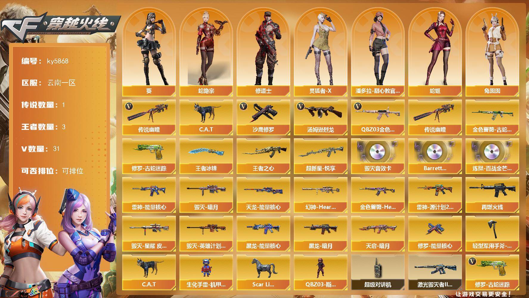 [17307702]云南一区-28V-3王者武器数-0炫金武器数 【传说武器】:传说幽瞳 【热门武器】:传说幽瞳,QBZ03-金色蔷薇,金色蔷薇-古蛇迷踪,修罗-古蛇迷踪,C.A.T,汤姆逊-烈龙,沙鹰-修罗*3 【王者炫金武器】:超新星-悦享,王者之心,王者冰锋 【音效卡】:Barrett-毁灭音效卡,Barrett-碧霄极光音效卡,炼狱-百战金芒-庆典舞曲音效卡 【皮肤】:幻神-Heartshot 皮肤,金色蔷薇-Heartshot皮肤,雷神-能量核心,雷神-源计划2.0专属 皮肤,M4A1-再燃火线,毁灭-暗月,毁灭-星耀 皮肤,毁灭-英雄计划 皮肤,黑龙-能量核心,黑龙-暗月,天启-暗月,天龙-能量核心,修罗-能量核心,轻型军用手斧-再燃火线 【角色】:葵,蛇隐宗,修道士,0号玩家,灵狐者-X,潘多拉-甜心教官,蛇姬,兔囡囡 【人偶武器】:Scar Light-马枪,C.A.T,生化手雷-机甲核心,QBZ03-斯沃特 【暴走生化】:超级对讲机 【挑战大师】:激光毁灭者III-白马银枪 【英雄级武器】:M4A1-黑龙,M4A1-雷神*2,M4A1-死神,M4A1-武圣,金色蔷薇-古蛇迷踪,QBZ03-金色蔷薇,AWM-天龙,Barrett-毁灭,炼狱-百战金芒,汤姆逊-烈龙,沙鹰-修罗*3,修罗-古蛇迷踪,屠龙*2,擎天,麒麟刺,麒麟刺-百战金芒,高爆手雷-古蛇迷踪,烟雾弹-古蛇迷踪,M4A1-苍鸣雷神 【道具】:CFS限定背包,古蛇迷踪炫彩背包,女皇终结者-背包,战舰背包,炫彩背包,百战金芒炫彩背包,超级背包,救世主-黑桃战神,绿色巨人,灵魂忍者,变异宝贝,迷雾幽灵,夺命之镰,防化服*3,流光-再燃火线,枪王排位28赛季金色流光,枪王排位29赛季金色流光,语音特效-盛典烟火,古蛇迷踪打击特效,蛇隐宗表情,萌萌小葵表情,斯沃特表情,EP战队名片,EP战队喷图,C4-红龙,C4-再燃火线*2,防弹头盔*3,防弹衣*3,C4工具钳*3,手雷包*3 【特殊枪械】:1烈龙