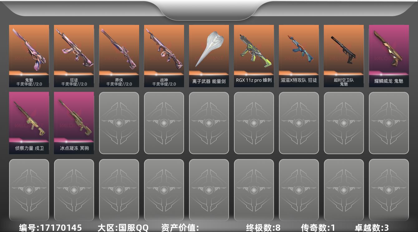- [15593837]安徽一区-193V-37王者-6炫金 【传说角色】:传说女帝 【热门武器】:QBZ03-金色蔷薇*3,Scar Light-白虎,HK417-朱雀,M200-幻神,M200-竞技荣光,死亡之眼,荣耀世冠-火麒麟,荣耀世冠-雷神,白虎-电玩蓝兔,柯尔特-冠军之特*2,荣耀世冠-柯尔特,Kar98K-星神,M4A1-黑骑士*5,汤姆逊-烈龙*6,RPK-盘龙,加特林-炼狱*8,斯泰尔-蝴蝶,降世魔童,火麒麟-绝迹,USP-雷暴,COP-堕天神*2,沙鹰-修罗*7,Knife-冠军之刃*2,荣耀世冠-龙啸,金刚伞 【王者炫金武器】:王者之武*2,王者之魄*3,王者之心*3,王者之光*2,炼狱-悦蓝,王者云击,炫金火麒麟,炫金雷神,炫金武士,炫金毁灭,炫金天神*2 【音效卡】:M200-幻神音效卡,AK47-火麒麟音效卡,M4A1-雷神音效卡*2,M4A1-黑骑士音效卡,Barrett-毁灭音效卡*2,AWM-裁决音效卡,Barrett-碧霄极光音效卡 【皮肤】:幻神-冠军之幻,幻神-AG-CFPLS17冠军,幻神-青鹤,幻神-荣耀世冠EP 皮肤,Scar Light-白虎-暗星*2,白虎-AG-CFPLS20冠军,QBZ03-冠军之薇,QBZ03-荣耀世冠白鲨,QBZ03-荣耀世冠EP 皮肤,裁决-巅峰荣耀 皮肤,雷神-能量核心,雷神-荣耀之魄*2,雷神-星空,雷神-耀金皮肤,雷神-冠军之魄,雷神-R.LGD-CFPLS18冠军,火麒麟-冠军之心,火麒麟-华夏之心,AK47-火麒麟-传奇EVEN,火麒麟-轻羽皮肤,传奇石头-横秒之巅,火麒麟-巅峰荣耀,火麒麟-大唐荣光,火麒麟-心动糖果,毁灭-荣耀之怒*2,毁灭-冠军之怒,毁灭-CFS2020,黑龙-能量核心,黑龙-冠军之武,黑骑士-暗月,黑骑士耀金皮肤,黑骑士-冠军之势,黑骑士-CFS2021,无影-能量核心,无影耀金皮肤*2,战神-紫绶金章皮肤*2,AK47-B-常胜将军-曹操,AK47-B-常胜将军-刘备*3,AK47-B-常胜将军-孙权*2,天龙-能量核心,AWM-天龙-传奇70KG*3,AWM-天龙-传奇白鲨*2,极光-能量核心,炼狱-星空,修罗-能量核心*2,修罗-冠军之魂,屠龙-荣耀之锋*5,屠龙-荣耀世冠AG,龙啸-冠军之啸,擎天-冠军之击 【角色】:零,炫,迷迭香,沙漠玫瑰,雨棠,电竞教官-云悠悠,鹰,