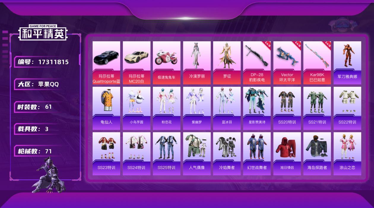 [17311815]地铁满天赋苹果 手Q-2粉装-3特效枪-3载具-1粉色飞行器-26002热力值-8王牌印记-61套装-71枪皮【热门品类】:角色-军刀雅典娜,套装-龟仙人【粉色套装】:角色-冷漠罗丽,角色-罗征【粉色枪皮等级】:Vector-环太平洋(五级),Kar98K-巳巳如意(五级),DP-28-豹影疾电(五级)【粉色载具】:玛莎拉蒂MC20(星石白),玛莎拉蒂Quattroporte(夜幕蓝),极速兔兔车【粉色枪皮】:Vector-环太平洋,Kar98K-巳巳如意,DP-28-豹影疾电