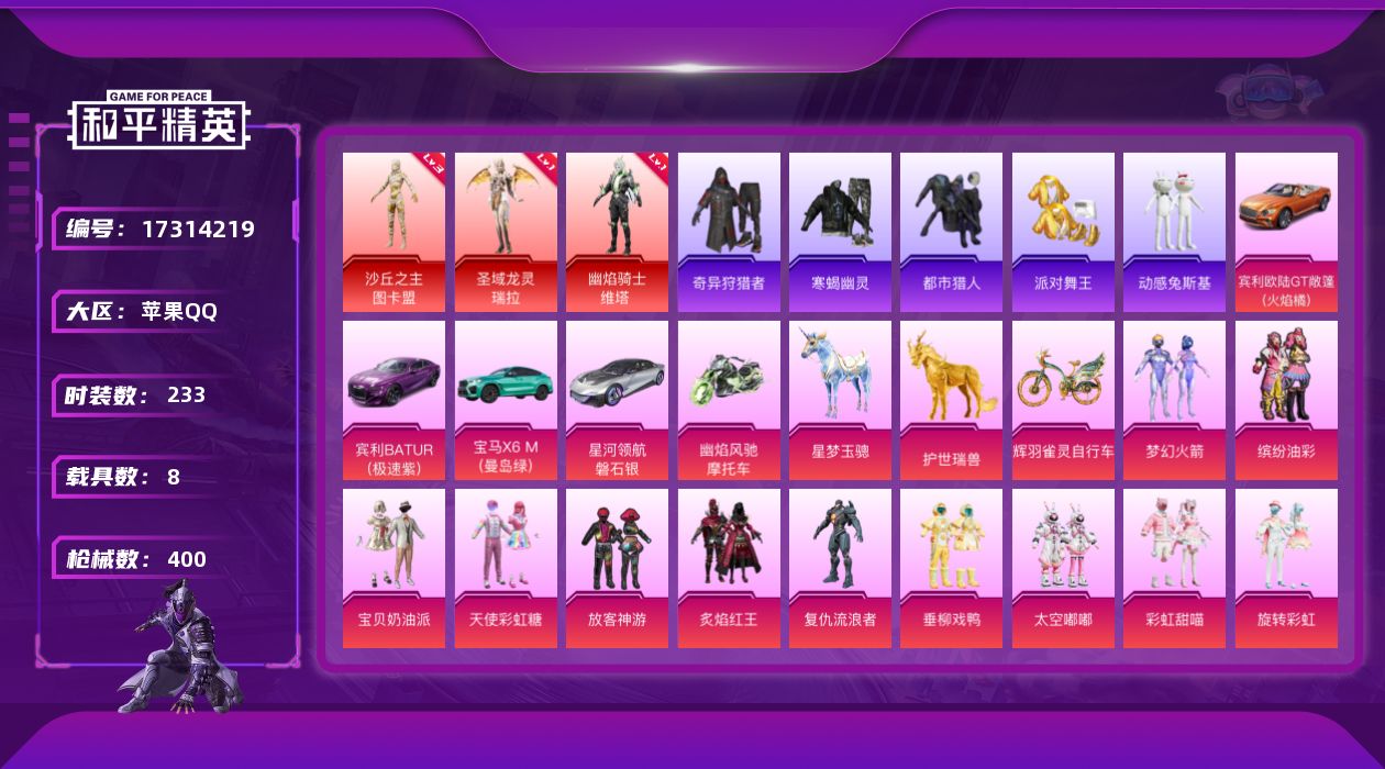 [17314219]【1147】苹果 手Q-3神装-33粉装-41特效枪-8载具-18粉色飞行器-157177热力值-17王牌印记-233套装-400枪皮