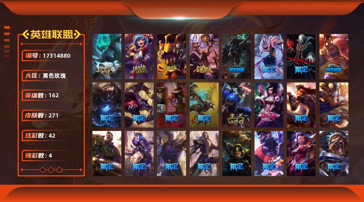 [17314880]【店主推荐捡漏号】(打十把匹配可排位)未定级段位-162英雄-271皮肤-42炫彩-0终极-2神话-30限定-29传说-79史诗