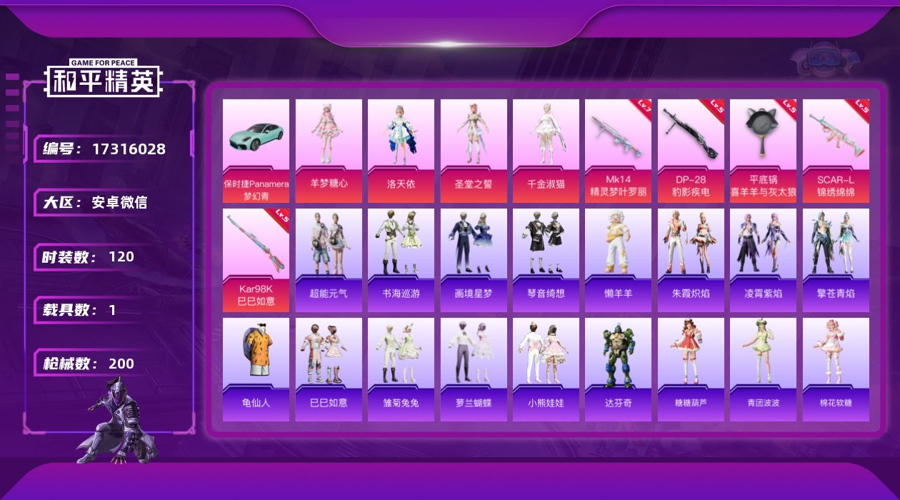 [17316028]【特价出售/店主推荐】安卓 微信-5粉装-8特效枪-1载具-4粉色飞行器-61069热力值-9王牌印记-120套装-200枪皮 【热门品类】:套装-龟仙人 【粉色套装】:角色-洛天依,角色-圣堂之誓,角色-千金淑猫,角色-羊梦糖心,角色-月中灵 【粉色枪皮等级】:AKM-暮色玫影(三级),SCAR-L-锦绣绵绵(五级),UMP45-萌骑冒险(二级),Kar98K-巳巳如意(五级),Mk14-精灵梦叶罗丽(七级),Mk14-福马献瑞(五级),DP-28-豹影疾电(五级),平底锅-喜羊羊与灰太狼(七级) 【粉色载具】:保时捷Panamera(梦幻青) 【粉色枪皮】:AKM-暮色玫影,SCAR-L-锦绣绵绵,UMP45-萌骑冒险,Kar98K-巳巳如意,Mk14-精灵梦叶罗丽,Mk14-福马献瑞,DP-28-豹影疾电,平底锅-喜羊羊与灰太狼 【粉色飞行器】:炫彩糖果飞行器,天之羽翼飞行器,萌物绒绒飞行器,暮色之舞飞行器 【粉色降落伞】:绝对恒星降落伞,恐龙拽拽降落伞,星夜魔法师降落伞,第五大道降落伞,猪猪侠降落伞,蜜语绒猫降落伞,精灵梦叶罗丽降落伞,冠军兔兔降落伞,未来领航者降落伞,月影灵韵降落伞,鬼刀降落伞,绯穹魔姬降落伞,炫彩糖果降落伞,霁蓝缠春降落伞,暮色玫影降落伞,罪夜之冕降落伞 【稀有套装】:套装-龟仙人,套装-巳巳如意,套装-超能元气,套装-雪国风尚,套装-炫彩糖果,套装-马上有钱,套装-雏菊兔兔,套装-萝兰蝴蝶,套装-小熊娃娃,角色-达芬奇,套装-糖糖葫芦,套装-青团波波,套装-棉花软糖,角色-都市丽猫,角色-怀庆长公主,套装-燕燕于飞,套装-鱼渊荷华,套装-晶辉守护,套装-霓虹热舞,套装-云朵鹅,套装-雪绒豹,套装-朱霞炽焰,套装-凌霄紫焰,套装-擎苍青焰,玩偶服-懒羊羊,套装-书海巡游,套装-画境星梦,套装-琴音绮想,角色-碧青流霞,角色-霜刃之御,套装-雨过天青,套装-红釉青花,角色-霜纹水星,角色-暖阳柴柴 【稀有枪皮】:AUG-冰晶雪宝,AKM-霓虹街区,AKM-龙的传人,AKM-玄冥寒域,M16A4-蓝色火焰,SCAR-L-炫彩节奏,SCAR-L-玉兔迎春,SCAR-L-红色方程式,M416-糯团青竹,M416-红色方程式,GROZA-暮色玫影,GROZA-晶梦幻蝶,AUG-耀粉歌者,AUG-金蛇镇世,AUG-绝对恒星,M762-彩虹符号,M7