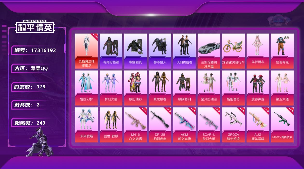 [17316192]【1113】苹果 手Q-1神装-13粉装-13特效枪-2载具-5粉色飞行器-86498热力值-12王牌印记-178套装-243枪皮