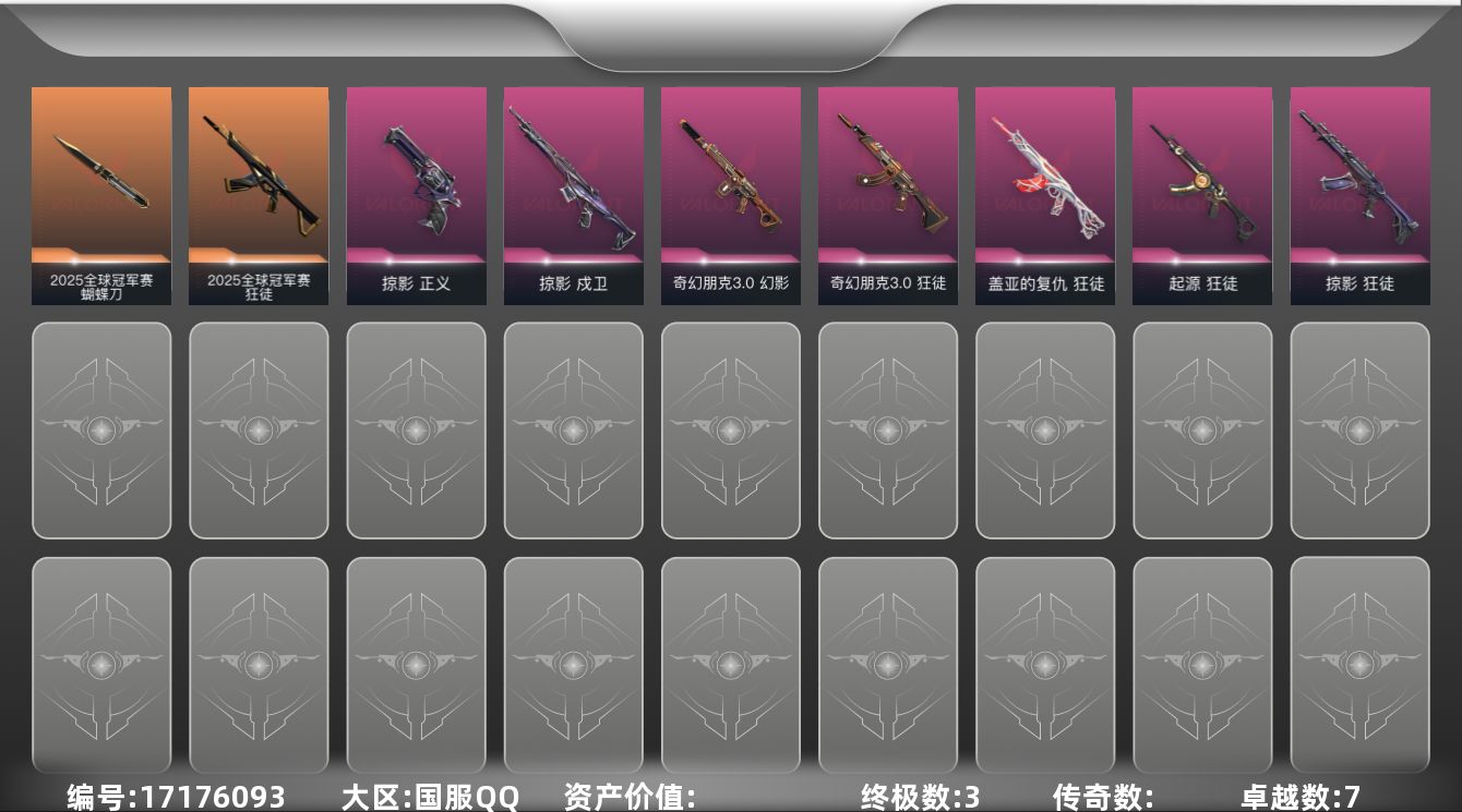 [17176093]【套装】:2025全球冠军赛套装 【英雄】:幻棱,炼狱,维斯,暮蝶,壹决,铁臂,捷风,不死鸟,贤者,猎枭,芮娜,尚勃勒,霓虹,盖可,黑梦 【近战武器】:近战武器-2025全球冠军赛 蝴蝶刀,近战武器-魔术火花,近战武器-魔术火花 【狂徒】:狂徒-2025全球冠军赛,狂徒-掠影,狂徒-盖亚的复仇,狂徒-起源,狂徒-奇幻朋克//3.0 【幻影】:幻影-奇幻朋克//3.0 【戍卫】:戍卫-掠影 【正义】:正义-掠影 【卡面】:《双城之战》拥抱 卡面,欢迎来到底城 卡面,南瓜盛典 卡面,正义的化身 卡面,梦幻奶茶 卡面,零点嗅探设计图 卡面,无畏契约GO!第一卷:零 卡面,代号红色 卡面,新兵报到 卡面,V契约 卡面,无畏契约 卡面 【喷漆】:嘭! 喷漆,都算到了 喷漆,熊抱 喷漆,捷风差距 喷漆,买装还是存钱 喷漆,胜利属于无畏契约 喷漆,GLHF 喷漆,无畏契约 喷漆 【挂饰】:第九季//第三幕 纪念币 挂饰,第九季//第二幕 纪念币 挂饰,第九季//第一幕 纪念币 挂饰,天外飞客 挂饰,无畏契约 纪念币 挂饰