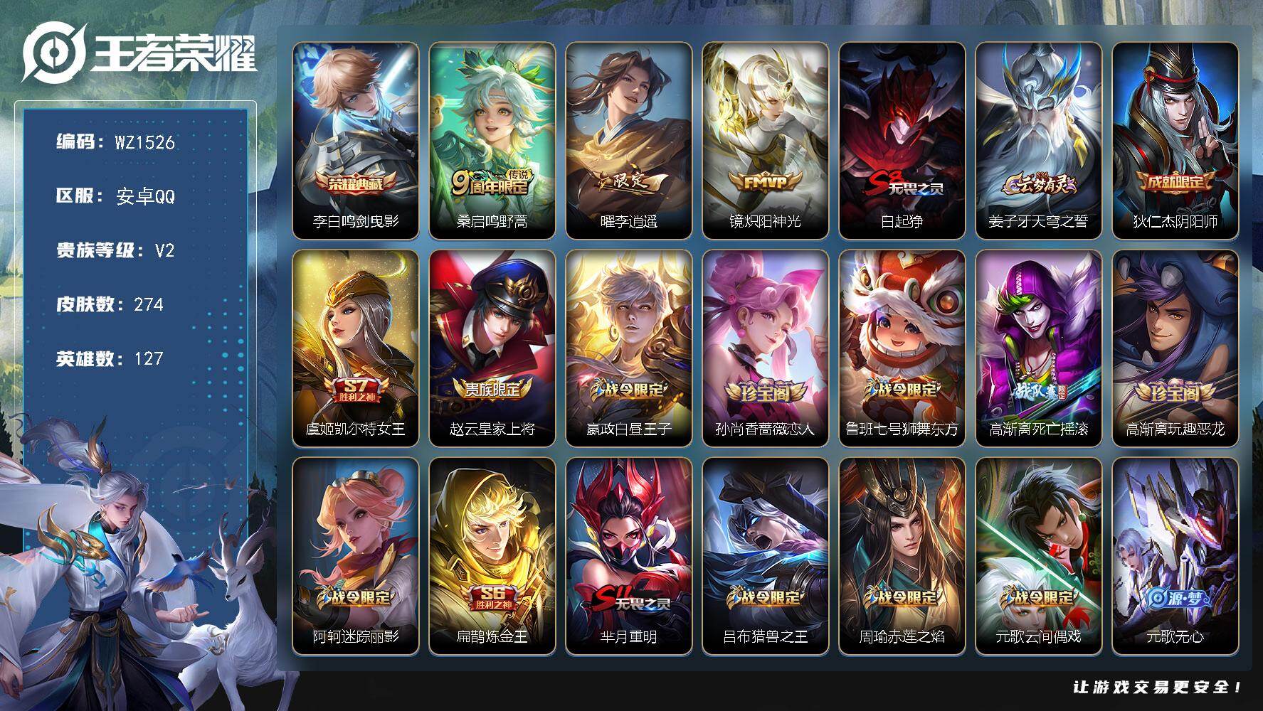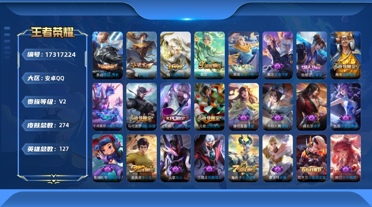 [17317224]安卓Q-V2-最强王者段位-127英雄-274皮肤-1典藏皮肤-3传说-66史诗