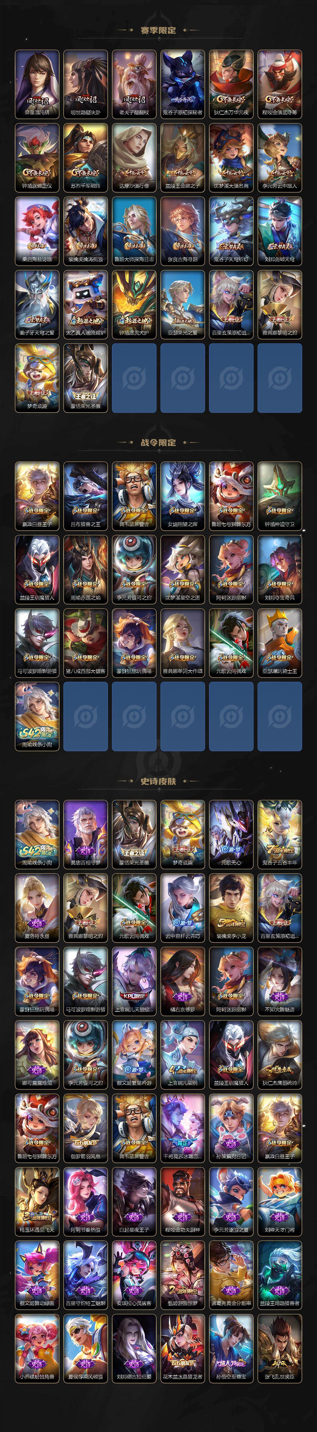 【赛季限定】:扁鹊炼金王,虞姬凯尔特女王,白起狰,太乙真人饕餮,曹操烛龙,芈月重明,典韦穷奇,狂铁御狮,米莱狄御霄,牛魔御旌,盾山御銮,夏侯惇朔风刀,弈星混沌棋,明世隐疑决卦,老夫子醍醐杖,鬼谷子原初探秘者,狄仁杰万华元夜,程咬金演武夺筹,钟馗驱傩正仪,苏烈千军破阵,达摩沙漠行僧,兰陵王金庭之子,沈梦溪大漠名商,李元芳云中旅人,桑启海盐诗旅,裴擒虎擒涛扼浪,鲁班大师探海日志,张良古海寻踪,鬼谷子天穹祈灯,刘邦剑破天穹,姜子牙天穹之誓,太乙真人谧流熔炉,钟馗虚灵犬护,亚瑟荣光之誓,百里玄策原初追逐者,雅典娜黎明之约,梦奇顽趣,蒙恬荣光圣徽