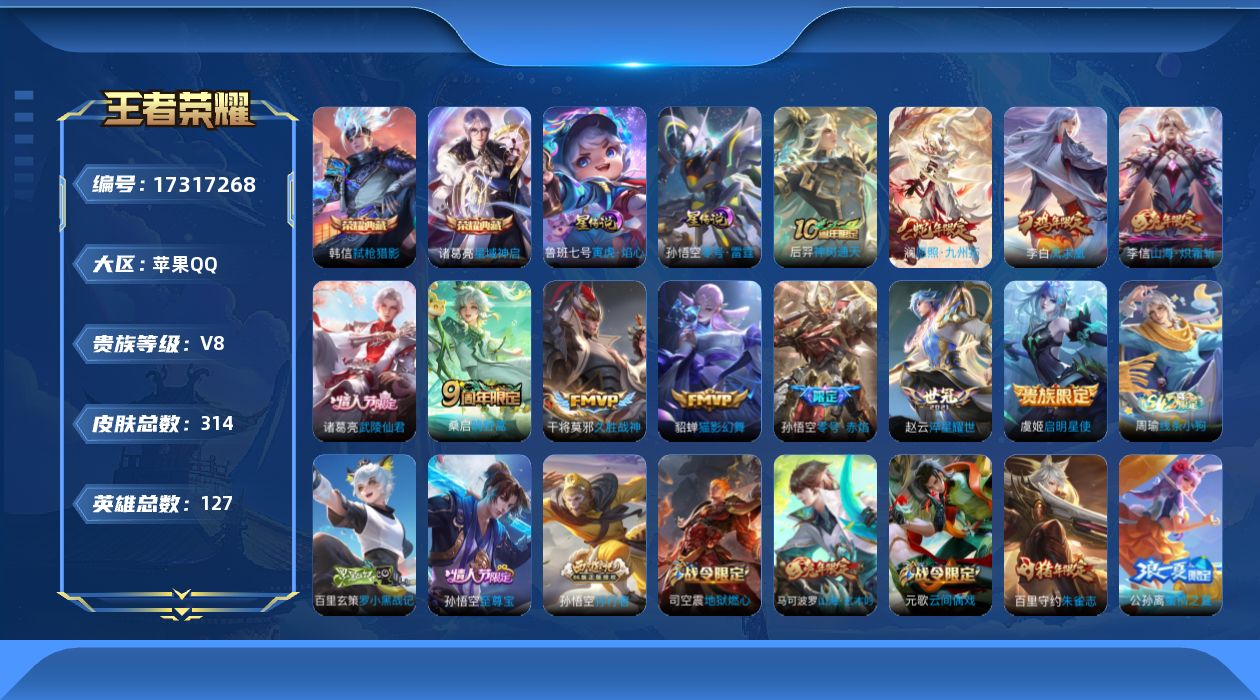 [17317268]【特价出售/店主推荐】苹果Q-V8-永恒钻石III段位-127英雄-309皮肤-2典藏皮肤-11传说-102史诗-2星元