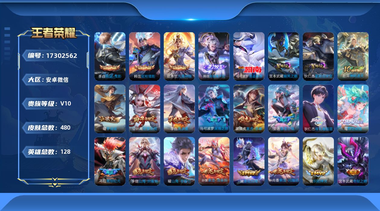[17302562]安卓WX-V10-最强王者段位-127英雄-477皮肤-3典藏皮肤-1无双-1珍品传说-57传说-152史诗-3星传说(时之思念,星际治安官,幽冥之眼)
