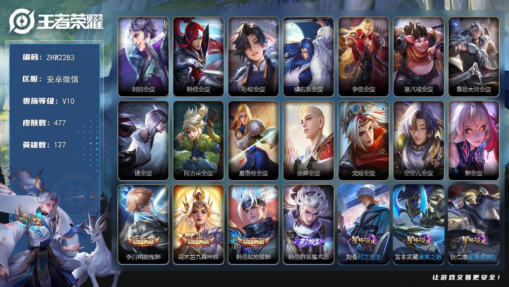 [17302562]安卓WX-V10-最强王者段位-127英雄-477皮肤-3典藏皮肤-1无双-1珍品传说-57传说-152史诗-3星传说(时之思念,星际治安官,幽冥之眼) 【英雄全皮】:刘邦全皮,韩信全皮,孙权全皮,橘右京全皮,李信全皮,猪八戒全皮,鲁班大师全皮,镜全皮,阿古朵全皮,夏洛特全皮,金蝉全皮,戈娅全皮,空空儿全皮,影全皮 【荣耀典藏】:李白鸣剑曳影,花木兰九霄神辉,韩信弑枪猎影 【无双皮肤】:韩信群星魔术团 【珍品传说】:马可波罗怪盗基德 【传说皮肤】:后羿神树通天,云缨幻光神枪,桑启鸣野蒿,亚连落雪白狼,吕布曦玄引,貂蝉曦玄引,孙尚香乘龙问璇玑,孙策乘龙淬吴钩,赵云乘龙铭钟鼎,马超琥珀纪元,澜逐花归海,艾琳觅芳踪,露娜霜月吟,狄仁杰夜礼服假面,云缨鹤归松栖,夏洛特浮生妄,干将莫邪画中仙,花木兰燃星之曲,虞姬无限倾心,伽罗炽翼辉光,孙悟空齐天大圣,曜山海苍雷引,李信山海炽霜斩,吕布怒海麟威,李白诗剑行,不知火舞绯月行,王昭君星穹之声,百里守约碎云,橘右京枫霜尽,马可波罗深海之息,后羿无尽星芒,马超无双飞将,露娜启示之音,瑶时之祈愿,裴擒虎寅虎赤拳,孙尚香异界灵契,赵云淬星耀世,曜李逍遥 ,兰陵王默契交锋,公孙离祈雪灵祝,诸葛亮时雨天司,铠绛天战甲,镜炽阳神光,虞姬启明星使,关羽武圣,曜云鹰飞将,李信一念神魔,刘备时之恋人,貂蝉猫影幻舞,虞姬云霓雀翎,梦奇胖达荣荣,后羿黄金射手座,诸葛亮武陵仙君,李白凤求凰,孙尚香末日机甲,宫本武藏地狱之眼,狄仁杰超时空战士 【限定皮肤】:白起狰,暃埋骨钱,蒙犽顽岩魄,蔡文姬夏日便利店,大乔绒语心约,虞姬夏日便利店,姜子牙天穹之誓,李白谪仙醉月,狄仁杰阴阳师,赵云皇家上将,赵云引擎之心,赵云龙胆,赵云百木心枪,墨子神迹守卫,妲己时之奇旅,嬴政优雅恋人,孙尚香蔷薇恋人,孙尚香异界灵契,庄周高山流水,高渐离玩趣恶龙,阿轲迷踪丽影,钟无艳超时空战士,扁鹊奇幻香踪,白起夜都怪侠,芈月白晶晶,芈月幻夜卜梦,吕布御风骁将,元歌云间偶戏,元歌无心,夏侯惇匿光决锋者,甄姬落雪兰心,典韦岱宗,马可波罗逐梦之星,马可波罗暗影游猎,马可波罗深海之息,马可波罗山海玄木吟,狄仁杰魔术师,狄仁杰万华元夜,达摩星际陆战队,达摩沙漠行僧,项羽海滩派对,项羽霸王别姬,老夫子醍醐杖,老夫子航海奇遇记,关羽武圣,程咬金演武夺筹,露娜启示之音,刘邦夺宝奇兵,韩信逐梦之影,韩信飞