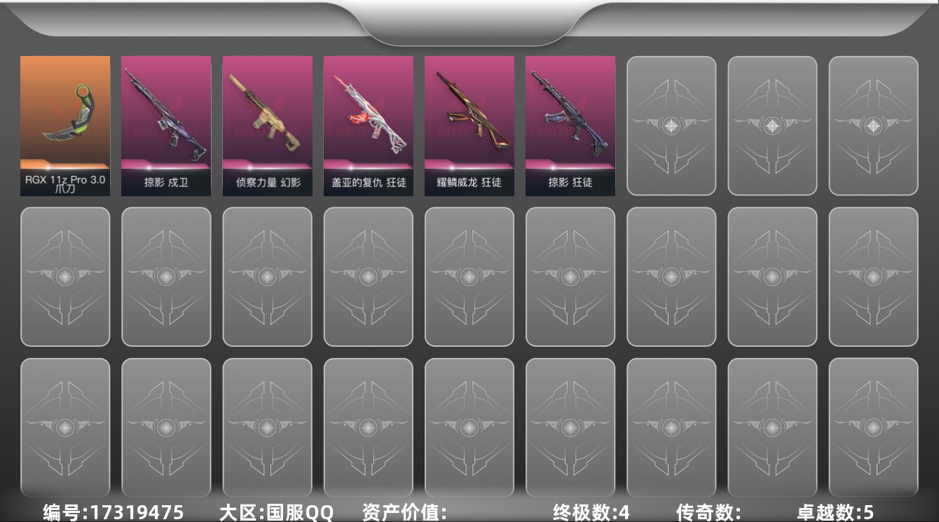[17319475]【英雄】:幻棱,炼狱,维斯,暮蝶,钛狐,壹决,铁臂,捷风,幽影,不死鸟,贤者,猎枭,蝰蛇,零,芮娜,奇乐,尚勃勒,霓虹,斯凯,夜露,K/O,盖可,黑梦,钢锁 【近战 武器】:近战武器-穿花蝴蝶,近战武器-剥皮小刀,近战武器-RGX 11z Pro//3.0 爪刀,近战武器-影刃 【狂徒】:狂徒-掠影,狂徒-盖亚的复仇,狂徒-耀鳞威龙 【幻影】:幻影-侦察力量 【戍卫】:戍卫-掠影 【正义】:正义-超限闪存,正义-纳米打击 【鬼魅】:鬼魅-诡秘蛇影,鬼魅-星云暗涌 【卡面】:终章:激斗汉堡 卡面,进入射程 卡面,《双城之战》拥抱 卡面,精灵大战 卡面,欢迎来到底城 卡面,南瓜盛典 卡面,修车达人 卡面,浮光跃金 卡面,正义的化身 卡面,复活专家 卡面,零点嗅探设计图 卡面,源能者美容 卡面,无畏契约GO!第一卷:芮娜 卡面,无畏契约GO!第一卷:零 卡面,无垠星环 卡面,钢锁vs盖可 卡面,代号红色 卡面,新兵报到 卡面,V契约 卡面,无畏契约 卡面 【喷漆】:嗨宝南瓜灯 喷漆,嘭! 喷漆,都算到了 喷漆,控场勿近 喷漆,小丑猫 喷漆,熊抱 喷漆,买装还是存钱 喷漆,胜利属于无畏契约 喷漆,GLHF 喷漆,无畏契约 喷漆 【挂饰】:终章:猫猫木乃伊 挂饰,悠闲鸡块 挂饰,伞绳 挂饰,《双城之战》小蛋糕 挂饰,第九季//第三幕 纪念币 挂饰,工具腰带 挂饰,鱼骨头 挂饰,熔岩灯 挂饰,第九季//第二幕 纪念币 挂饰,Z世代特饮 挂饰,深海水母 挂饰,天外飞客 挂饰,无畏契约 纪念币 挂饰