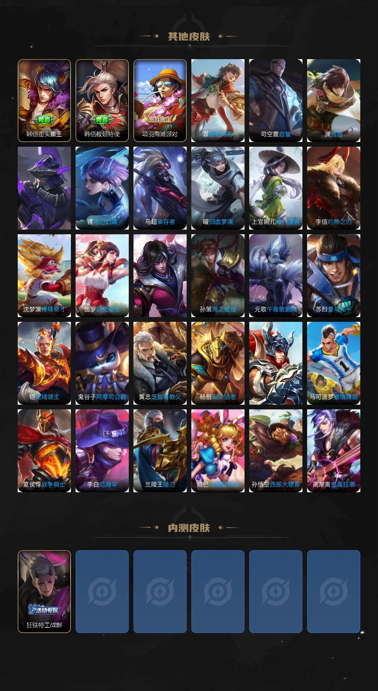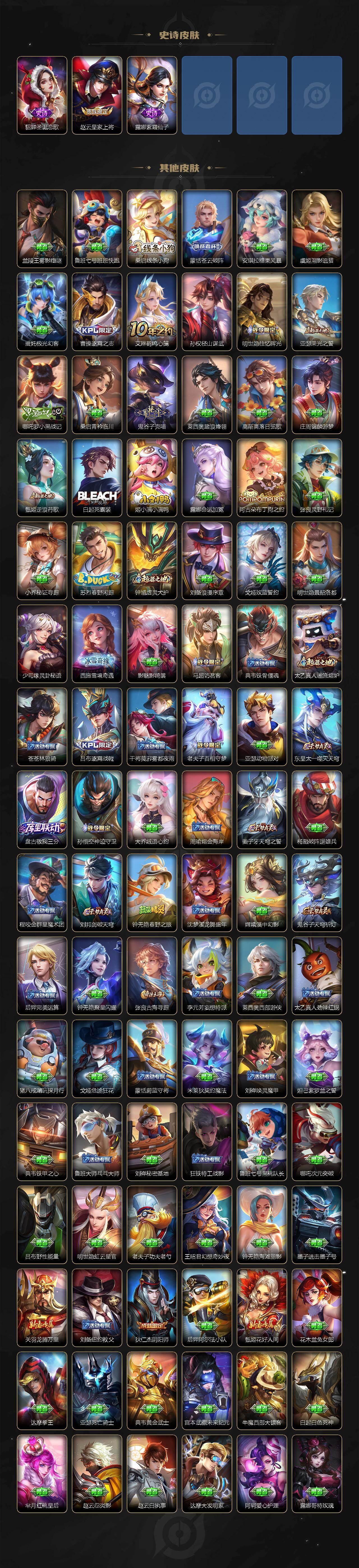 【史诗皮肤】:钟馗锁墨魂,周瑜线条小狗,小乔线条小狗,项羽九幽镇关,少司缘巫礼祀神,女娲万灵启世,百里玄策罗小黑战记,莱西奥光弋星穹,公孙离涂山容容,黄忠百相守梦,狂铁龙之律动,阿轲化蝶舞,弈星万物之道,孙膑茶境仙,牛魔星界战将,百里守约百相守梦,亚连破空之剑,蒙犽顽岩魄,阿古朵江河有灵,司空震地狱燃心,杨戬天秀启明,百里玄策原初追逐者,马可波罗暗影游猎,狄仁杰鹰眼统帅,孙策猫狗日记,阿轲节奏热浪,白起星夜王子,程咬金功夫厨神,李元芳逐浪之夏,蔡文姬舞动绿茵,百里守约特工魅影,雅典娜冰冠公主,诸葛亮黄金分割率,兰陵王暗隐猎兽者,花木兰水晶猎龙者,张飞乱世虎臣,吕布末日机甲,李白千年之狐,曹操幽灵船长,刘禅绅士熊喵,墨子金属风暴,妲己魅力维加斯,嬴政摇滚巨星,孙尚香水果甜心,宫本武藏鬼剑武藏,廉颇地狱岩魂,王昭君偶像歌手,甄姬冰雪圆舞曲,貂蝉圣诞恋歌,赵云皇家上将,露娜紫霞仙子