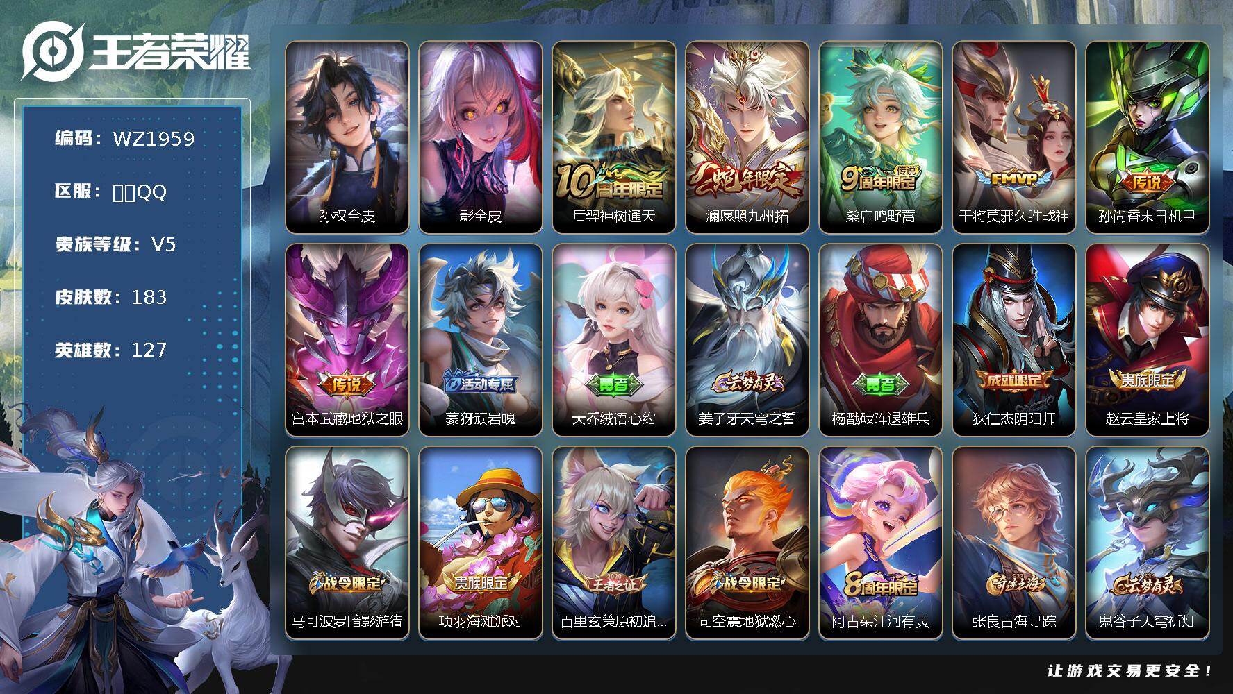 [17321380]安卓Q-183皮肤-6传说-50史诗 【英雄全皮】:孙权全皮,影全皮 【传说皮肤】:后羿神树通天,澜愿照九州拓,桑启鸣野蒿,干将莫邪久胜战神,孙尚香末日机甲,宫本武藏地狱之眼 【限定皮肤】:蒙犽顽岩魄,大乔绒语心约,姜子牙天穹之誓,杨戬破阵退雄兵,狄仁杰阴阳师,赵云皇家上将,马可波罗暗影游猎,项羽海滩派对,百里玄策原初追逐者,司空震地狱燃心,阿古朵江河有灵,张良古海寻踪,鬼谷子天穹祈灯,沈梦溪龙舞盛年,刘邦剑破天穹,程咬金群星魔术团,周瑜熔金海岸 【年限皮肤】:澜愿照九州拓 【赛季限定】:张良古海寻踪,鬼谷子天穹祈灯,刘邦剑破天穹,姜子牙天穹之誓,东皇太一噬灭天穹,太乙真人谧流熔炉,钟馗虚灵犬护,甄姬逆浪荇歌,亚瑟荣光之誓,百里玄策原初追逐者,牛魔星界战将,项羽九幽镇关 【战令限定】:马可波罗暗影游猎,司空震地狱燃心,亚连破空之剑,孙悟空神迹守卫,百里守约百相守梦,老夫子百相守梦,孙膑茶境仙,马超访茗客,莱西奥光弋星穹,明世隐往忆晖光,周瑜线条小狗,小乔线条小狗 【史诗皮肤】:钟馗锁墨魂,周瑜线条小狗,小乔线条小狗,项羽九幽镇关,少司缘巫礼祀神,女娲万灵启世,百里玄策罗小黑战记,莱西奥光弋星穹,公孙离涂山容容,黄忠百相守梦,狂铁龙之律动,阿轲化蝶舞,弈星万物之道,孙膑茶境仙,牛魔星界战将,百里守约百相守梦,亚连破空之剑,蒙犽顽岩魄,阿古朵江河有灵,司空震地狱燃心,杨戬天秀启明,百里玄策原初追逐者,马可波罗暗影游猎,狄仁杰鹰眼统帅,孙策猫狗日记,阿轲节奏热浪,白起星夜王子,程咬金功夫厨神,李元芳逐浪之夏,蔡文姬舞动绿茵,百里守约特工魅影,雅典娜冰冠公主,诸葛亮黄金分割率,兰陵王暗隐猎兽者,花木兰水晶猎龙者,张飞乱世虎臣,吕布末日机甲,李白千年之狐,曹操幽灵船长,刘禅绅士熊喵,墨子金属风暴,妲己魅力维加斯,嬴政摇滚巨星,孙尚香水果甜心,宫本武藏鬼剑武藏,廉颇地狱岩魂,王昭君偶像歌手,甄姬冰雪圆舞曲,貂蝉圣诞恋歌,赵云皇家上将,露娜紫霞仙子 【其他皮肤】:兰陵王雾影缉谜,鲁班七号班班快跑,桑启线条小狗,蒙恬苍云破阵,安琪拉糖果风暴,虞姬溯影追猎,蚩奼极光幻客,曹操逐霄之志,艾琳鹤鸣心笺,孙权径山谋武,明世隐往忆晖光,亚瑟荣光之誓,哪吒罗小黑战记,桑启青衿临川,鬼谷子克喵,莱西奥踏浪烽翎,高渐离落日弦歌,庄周锦麟游梦,甄姬逆浪荇歌,白起死霸装,姬小满小满鸭,露娜命运加冕,