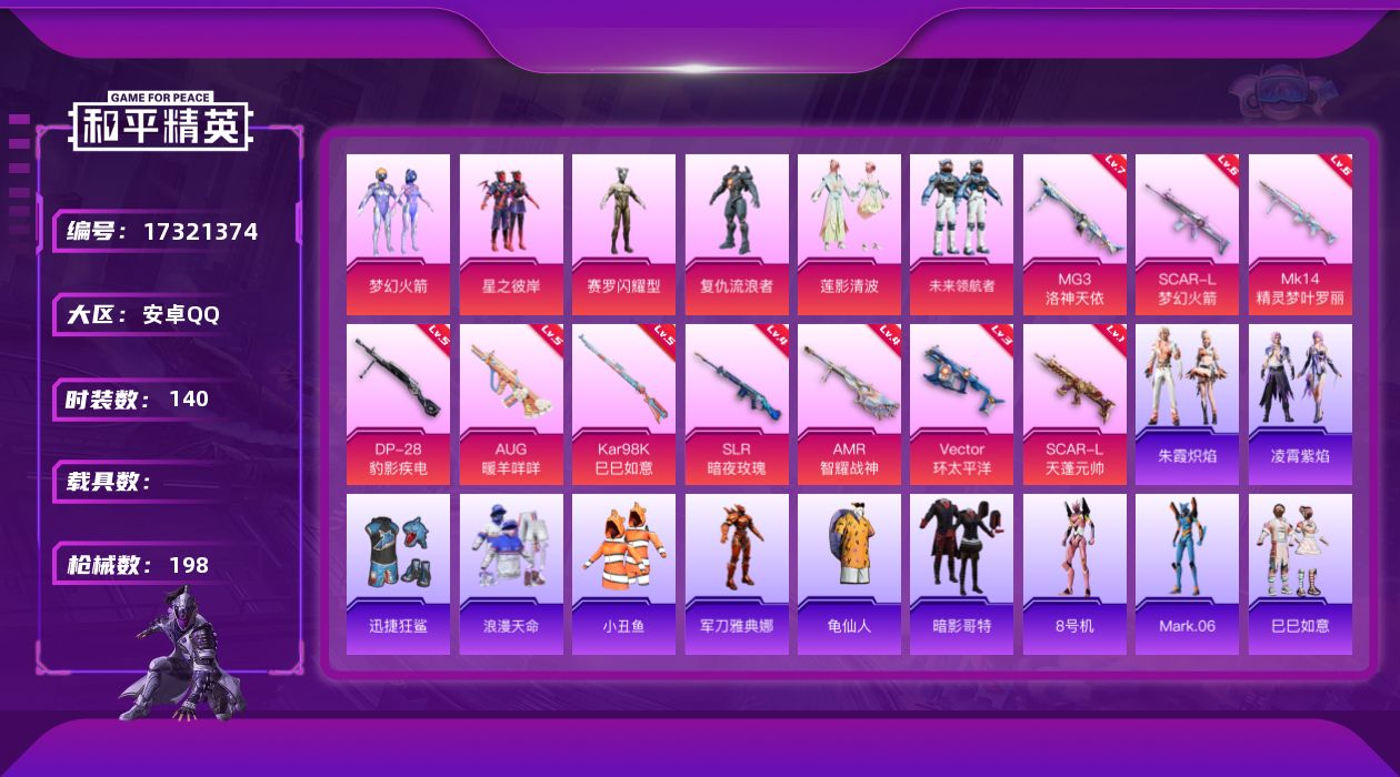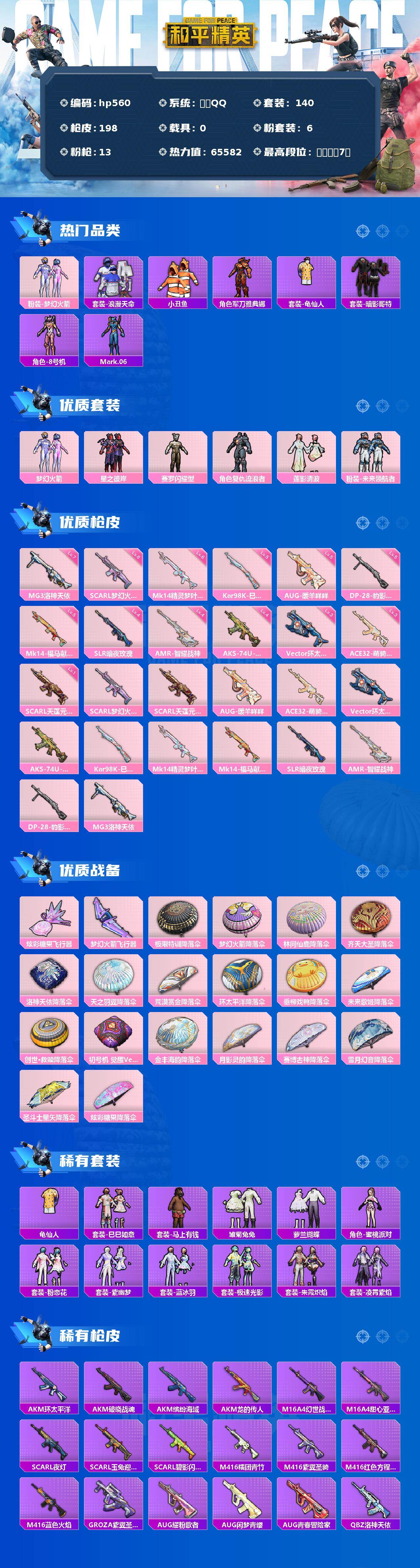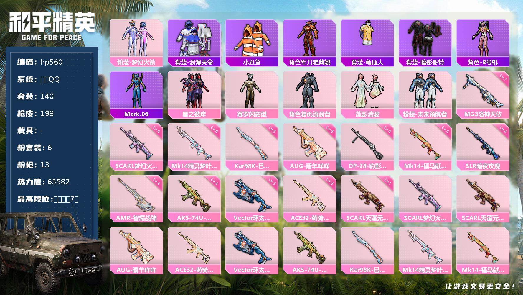 [17321374]安卓 手Q-6粉装-13特效枪-0载具-2粉色飞行器-65582热力值-7王牌印记-140套装-198枪皮 【热门品类】:粉装-梦幻火箭,套装-浪漫天命,套装-小丑鱼,角色-军刀雅典娜,套装-龟仙人,套装-暗影哥特,角色-8号机,角色-Mark.06 【粉色套装】:粉装-梦幻火箭,粉装-星之彼岸,角色-赛罗闪耀型,角色-复仇流浪者,粉装-莲影清波,粉装-未来领航者 【粉色枪皮等级】:SCAR-L-梦幻火箭(六级),SCAR-L-天蓬元帅(一级),AUG-暖羊咩咩(五级),ACE32-萌骑漫游(三级),Vector-环太平洋(三级),AKS-74U-森灵之息(四级),Kar98K-巳巳如意(五级),Mk14-精灵梦叶罗丽(六级),Mk14-福马献瑞(五级),SLR-暗夜玫瑰(四级),AMR-智耀战神(四级),DP-28-豹影疾电(五级),MG3-洛神天依(七级) 【粉色枪皮】:SCAR-L-梦幻火箭,SCAR-L-天蓬元帅,AUG-暖羊咩咩,ACE32-萌骑漫游,Vector-环太平洋,AKS-74U-森灵之息,Kar98K-巳巳如意,Mk14-精灵梦叶罗丽,Mk14-福马献瑞,SLR-暗夜玫瑰,AMR-智耀战神,DP-28-豹影疾电,MG3-洛神天依 【粉色飞行器】:炫彩糖果飞行器,梦幻火箭飞行器 【粉色降落伞】:极限特训降落伞,梦幻火箭降落伞,林间仙鹿降落伞,齐天大圣降落伞,洛神天依降落伞,天之羽翼降落伞,荒漠赏金降落伞,环太平洋降落伞,垂柳戏鸭降落伞,未来歌姬降落伞,创世·救赎降落伞,初号机 觉醒Ver.降落伞,金丰海韵降落伞,月影灵韵降落伞,赛博古神降落伞,雪月幻音降落伞,圣斗士星矢降落伞,炫彩糖果降落伞 【稀有套装】:套装-龟仙人,套装-巳巳如意,套装-炫彩糖果,套装-马上有钱,套装-雏菊兔兔,套装-萝兰蝴蝶,角色-蜜桃派对,套装-粉恋花,套装-紫幽梦,套装-蓝冰羽,套装-极速光影,套装-朱霞炽焰,套装-凌霄紫焰 【稀有枪皮】:AKM-环太平洋,AKM-破晓战魂,AKM-缤纷海域,AKM-龙的传人,M16A4-幻世战舞者,M16A4-甜心亚梦,SCAR-L-夜灯,SCAR-L-玉兔迎春,SCAR-L-碧影闪光,M416-糯团青竹,M416-紫翼圣骑,M416-红色方程式,M416-蓝色火焰,GROZA-紫翼圣骑,AUG-耀粉歌者,AUG-闲梦青缨,AUG-
