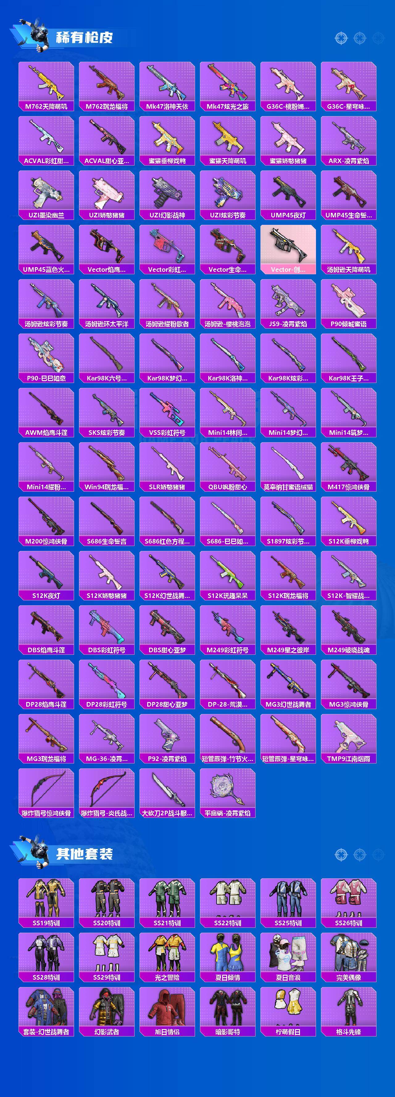 【稀有枪皮】:AKM-环太平洋,AKM-破晓战魂,AKM-缤纷海域,AKM-龙的传人,M16A4-幻世战舞者,M16A4-甜心亚梦,SCAR-L-夜灯,SCAR-L-玉兔迎春,SCAR-L-碧影闪光,M416-糯团青竹,M416-紫翼圣骑,M416-红色方程式,M416-蓝色火焰,GROZA-紫翼圣骑,AUG-耀粉歌者,AUG-闲梦青缨,AUG-