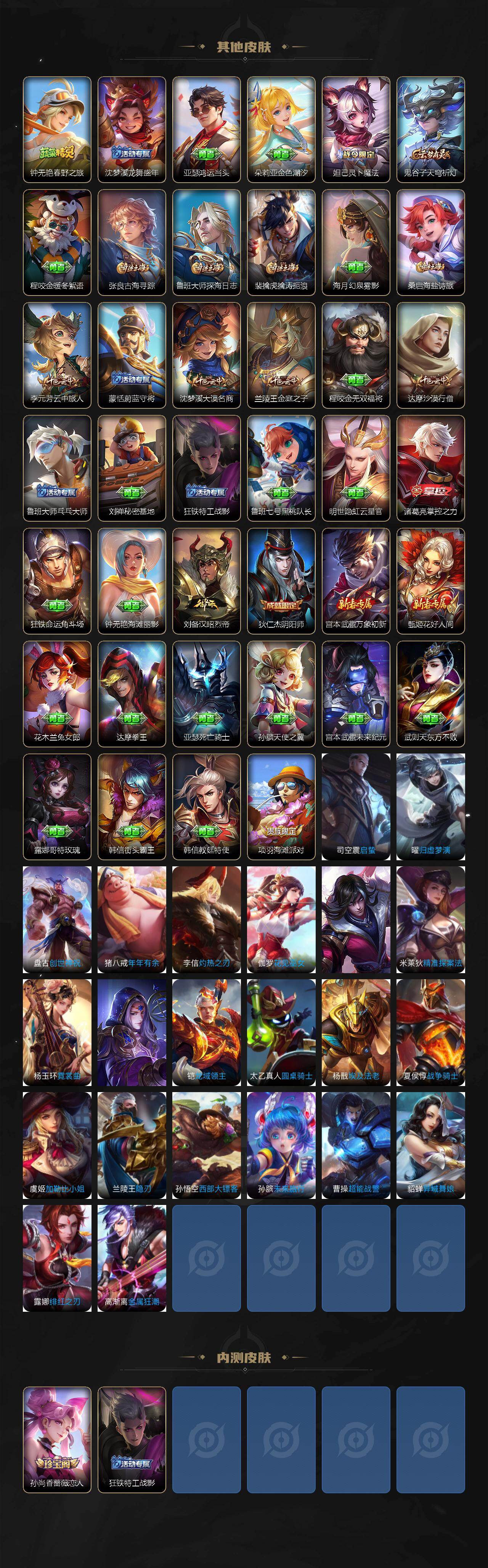 【赛季限定】:达摩沙漠行僧,兰陵王金庭之子,沈梦溪大漠名商,李元芳云中旅人,桑启海盐诗旅,裴擒虎擒涛扼浪,鲁班大师探海日志,张良古海寻踪,鬼谷子天穹祈灯,刘邦剑破天穹,姜子牙天穹之誓,东皇太一噬灭天穹,太乙真人谧流熔炉,钟馗虚灵犬护