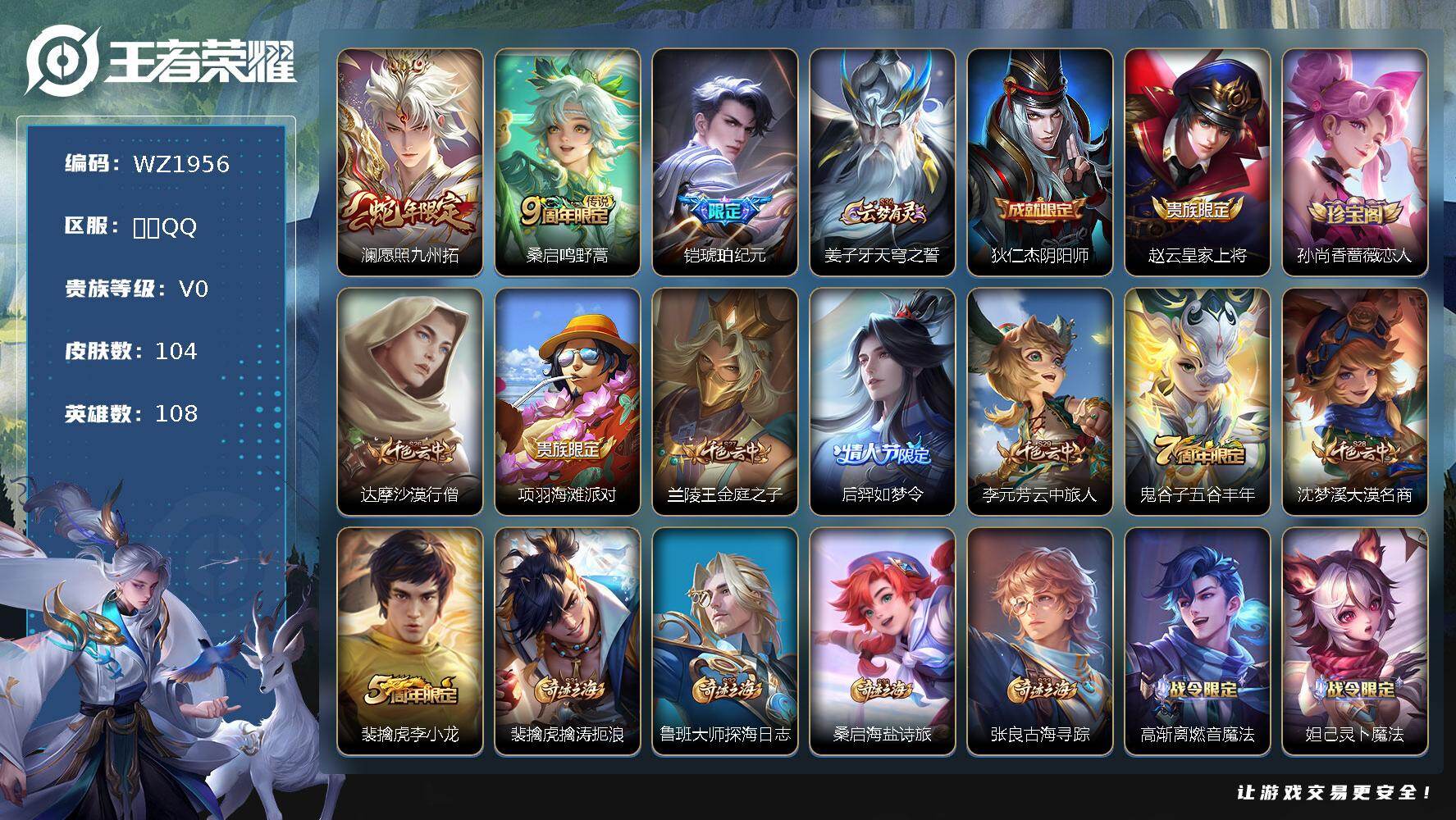 - [11880377]V7 1珍品传说 9传说 122英雄 146皮肤 可修改实名 优质装备:器灵·落星盏,黄金狮子座,黄金白羊座,地狱之眼,时之恋人-刘备(电焊工),淬星耀世 传说皮:祥瑞亨通 珍宝阁皮:玩趣恶龙 限定皮:愿照·山河定(司空震年限),鸣野蒿,怒海麟威,降魔,辉光之辰 史诗皮:器灵·浮梦炉,龙之律动,蒙犽顽岩魄,谪仙醉月,决胜骁骑,百相守梦-黄忠,白龙吟,特工魅影,千年之狐,百相守梦(刘备),魅语,冰冠公主,乱世虎臣,节奏热浪,女仆咖啡,摇滚巨星,水果甜心,绅士熊喵,天才门将,星夜王子,时之奇旅-安琪拉,功夫厨神,德古拉伯爵,暗隐猎兽者,鬼剑武藏,乘风破浪,鹰眼统帅,未来纪元-赵云