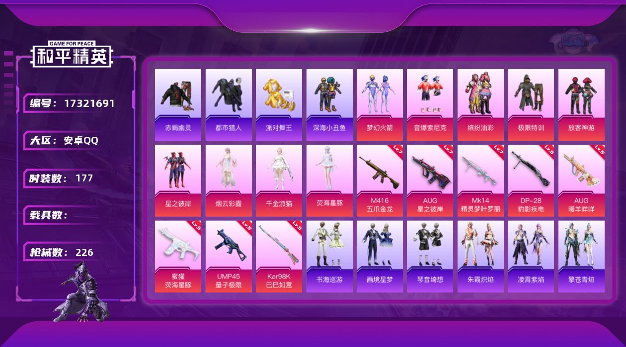 - [12229572]【5】安卓 手Q-2粉装-13特效枪-0载具-0粉色飞行器-56220热力值-6王牌印记-134套装-187枪皮 【热门品类】:套装-浪漫天命,套装-派对舞王,套装-金羽特工,套装-粉红小猪,角色-Mark.06 【粉色套装】:角色-智耀战神,角色-荧海星豚 【粉色枪皮等级】:AKM-绿萝繁花(五级),SCAR-L-锦绣绵绵(五级),M416-电玩时刻(五级),GROZA-镜光银凌(五级),AUG-暖羊咩咩(五级),M762-青锋波束(五级),UMP45-量子极限(五级),汤姆逊-热量炸弹(五级),Kar98K-巳巳如意(五级),Mk14-甜梦熊击(五级),DP-28-豹影疾电(五级),MG3-突变脉冲(五级),MG-36-沧焰双生(五级) 【粉色枪皮】:AKM-绿萝繁花,SCAR-L-锦绣绵绵,M416-电玩时刻,GROZA-镜光银凌,AUG-暖羊咩咩,M762-青锋波束,UMP45-量子极限,汤姆逊-热量炸弹,Kar98K-巳巳如意,Mk14-甜梦熊击,DP-28-豹影疾电,MG3-突变脉冲,MG-36-沧焰双生 【粉色降落伞】:甜心宝贝降落伞,洛神天依降落伞,精灵梦叶罗丽降落伞,忍者神龟降落伞,临安公主降落伞 【稀有套装】:套装-巳巳如意,套装-雏菊兔兔,套装-萝兰蝴蝶,角色-达芬奇,套装-糖糖葫芦,套装-青团波波,角色-临安公主,角色-怀庆长公主,套装-燕燕于飞,套装-鱼渊荷华,套装-紫幽梦,套装-蓝冰羽,套装-星影赞美诗,玩偶服-懒羊羊 【稀有枪皮】:AKM-彩虹符号,AKM-灼热熔岩,AKM-破晓战魂,AKM-萌趣颜团子,AKM-虎虎生威,AKM-霓虹街区,AKM-龙的传人,M16A4-幻世战舞者,SCAR-L-炫彩节奏,SCAR-L-玉兔迎春,SCAR-L-黄金龙骨,SCAR-L-冷漠罗丽,M416-夜灯,M416-糯团青竹,M416-红色方程式,M416-绯红前夜,GROZA-异彩先驱,GROZA-影袭,AUG-天降萌叽,AUG-甜蜜菠萝,AUG-耀粉歌者,QBZ-彩虹符号,QBZ-飞驰魅影,M762-天降萌叽,M762-瑞龙福将,M762-绯红前夜,Mk47-妙红点点,Mk47-百万伏特,G36C-时空追击者,G36C-暗夜玫瑰,G36C-星穹咏叹调,AC-VAL-天降萌叽,AC-VAL-快闪甜心,蜜獾-娇憨猪猪,UZI-天降萌叽,UZI-娇憨猪