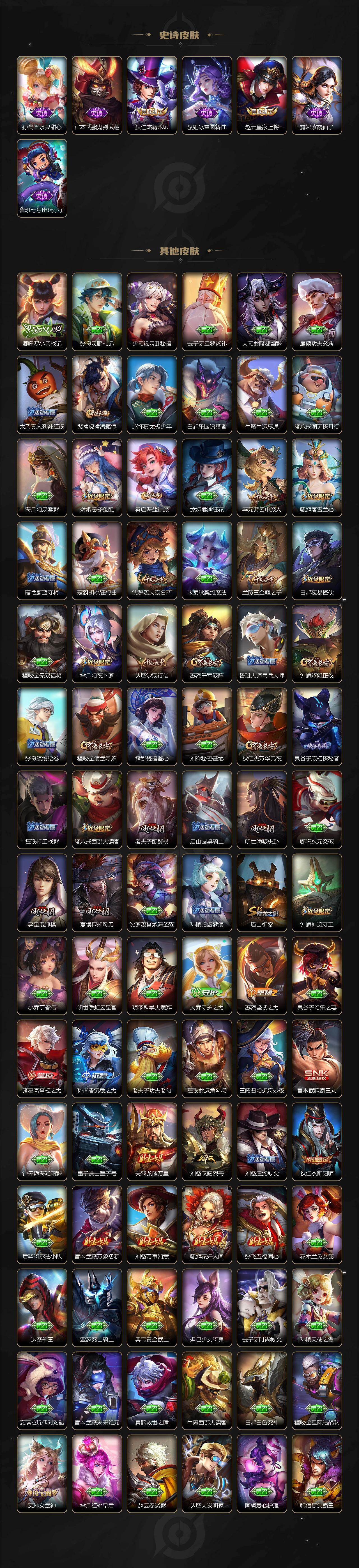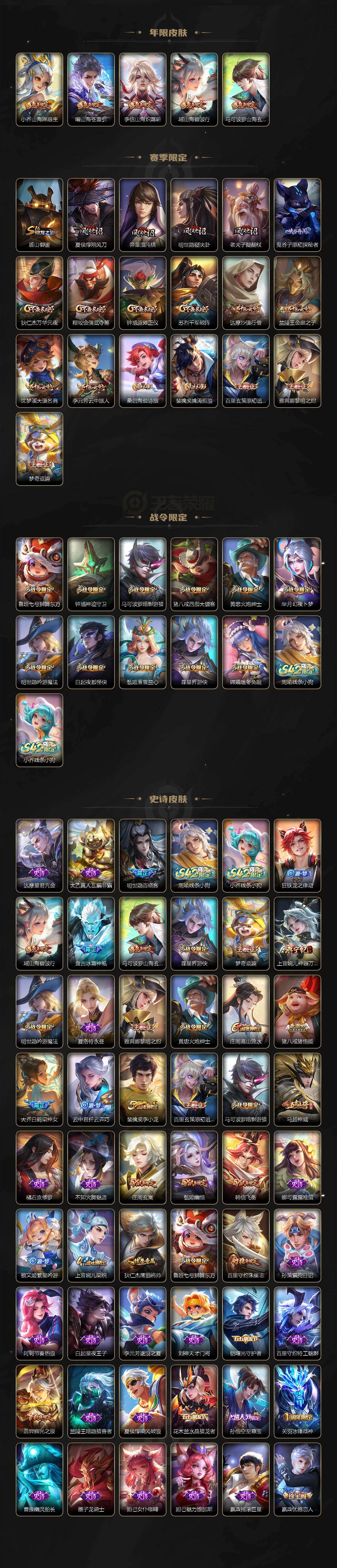 【限定皮肤】:狄仁杰阴阳师,小乔山海琳琅生,赵云皇家上将,嬴政优雅恋人,鲁班七号狮舞东方,庄周玄嵩,庄周高山流水,白起夜都怪侠,芈月幻夜卜梦,夏侯惇朔风刀,甄姬幽恒,甄姬落雪兰心,马可波罗暗影游猎,马可波罗山海玄木吟,狄仁杰魔术师,狄仁杰万华元夜,达摩沙漠行僧,项羽海滩派对,老夫子醍醐杖,关羽冰锋战神,程咬金演武夺筹,韩信飞衡,兰陵王金庭之子,花木兰燃星之曲,孙悟空至尊宝,孙悟空齐天大圣,后羿辉光之辰,李元芳云中旅人,虞姬启明星使,钟馗神迹守卫,钟馗驱傩正仪,杨戬永曜之星,雅典娜黎明之约,蔡文姬繁星吟游,鬼谷子原初探秘者,大乔白鹤梁神女,黄忠火炮绅士,苏烈千军破阵,百里玄策原初追逐者,百里守约朱雀志,弈星混沌棋,梦奇顽趣,沈梦溪大漠名商,明世隐疑决卦,明世隐吟游魔法,裴擒虎李小龙,裴擒虎擒涛扼浪,瑶山海碧波行,云中君纤云弄巧,李信山海炽霜斩,伽罗炽翼辉光,盾山御銮,孙策挚爱之约,猪八戒西部大镖客,猪八戒猪悟能,上官婉儿梁祝,上官婉儿神器万象笔,嫦娥暖冬兔眠,曜山海苍雷引,盘古冰霜神祇,桑启海盐诗旅,暃星界游侠,艾琳女武神