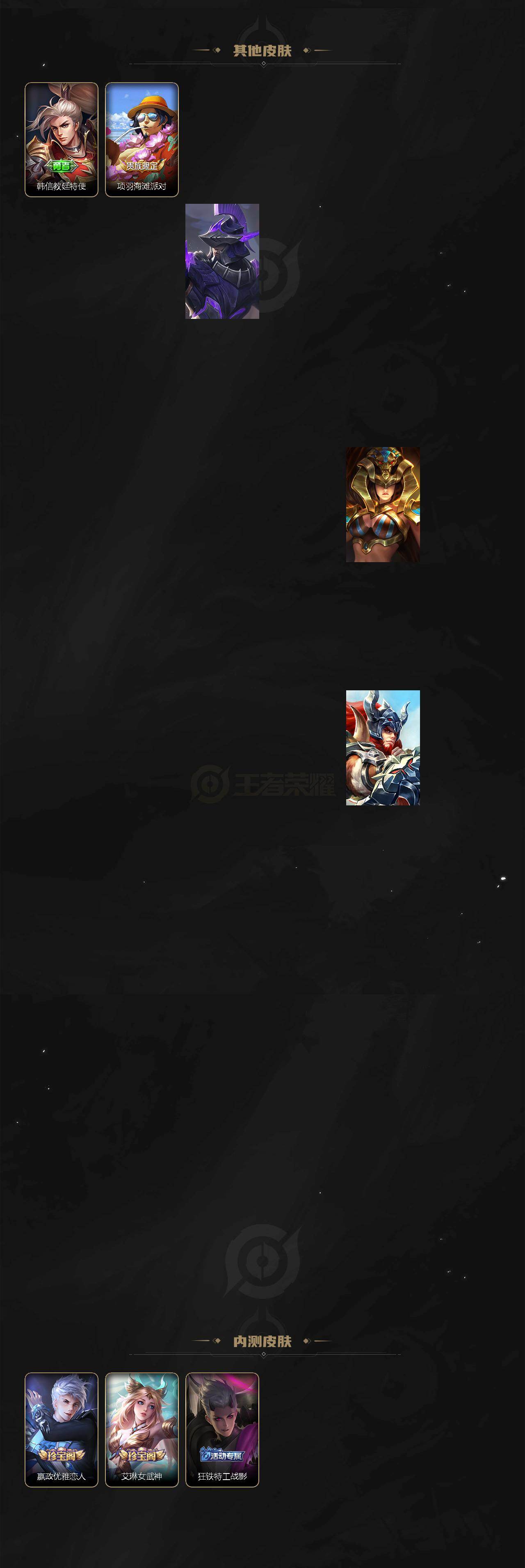 【战令限定】:鲁班七号狮舞东方,钟馗神迹守卫,马可波罗暗影游猎,猪八戒西部大镖客,黄忠火炮绅士,芈月幻夜卜梦,明世隐吟游魔法,白起夜都怪侠,甄姬落雪兰心,暃星界游侠,嫦娥暖冬兔眠,周瑜线条小狗,小乔线条小狗