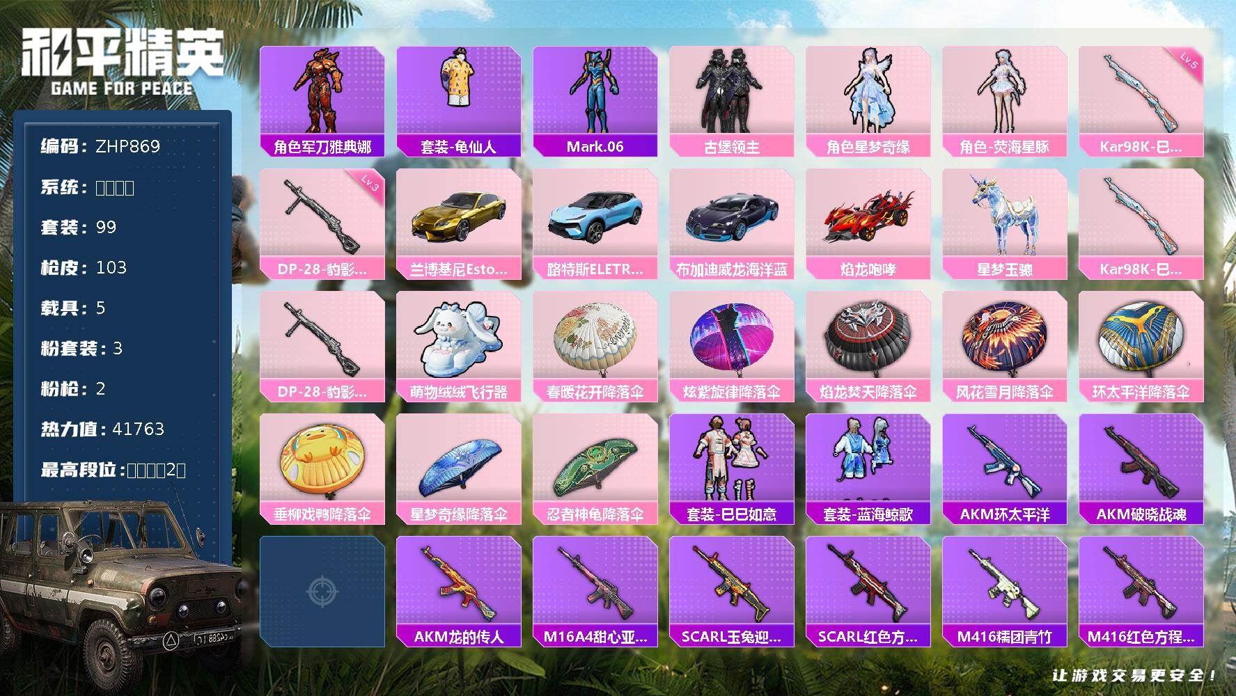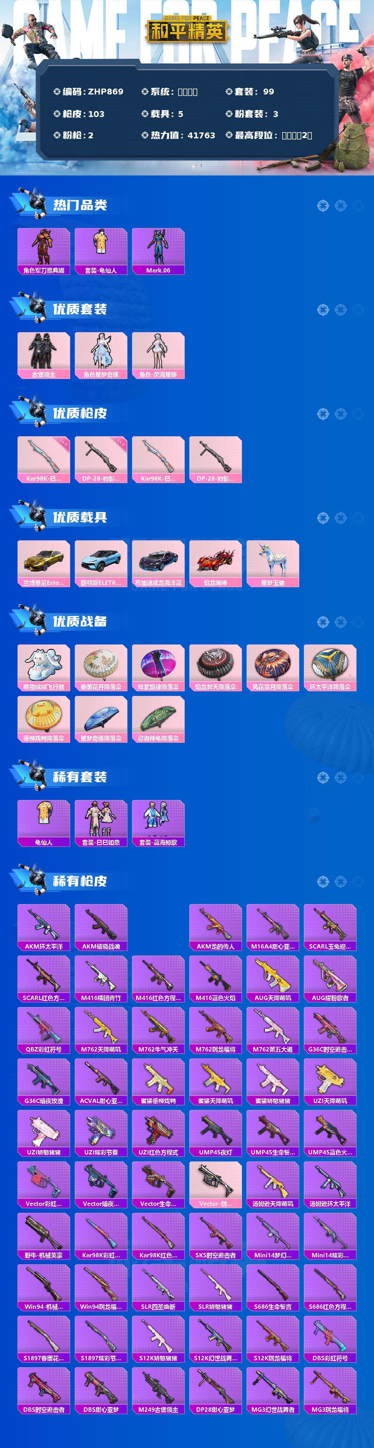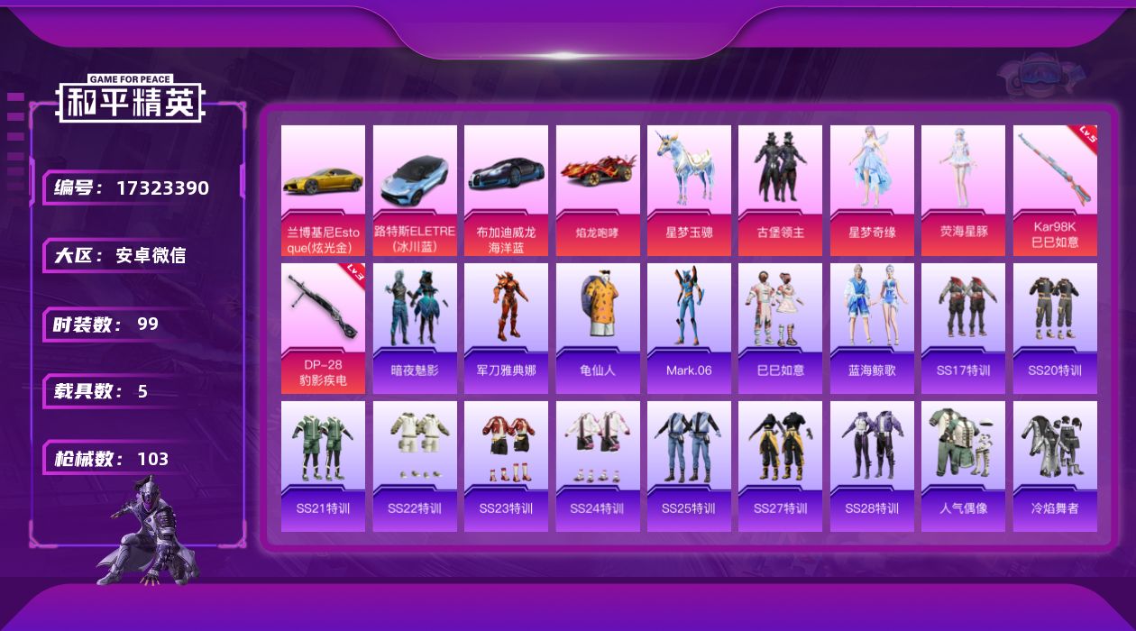 [17323390]安卓 微信-3粉装-2特效枪-5载具-1粉色飞行器-41763热力值-2王牌印记-99套装-103枪皮 【热门品类】:角色-军刀雅典娜,套装-龟仙人,角色-Mark.06 【粉色套装】:粉装-古堡领主,角色-星梦奇缘,角色-荧海星豚 【粉色枪皮等级】:Kar98K-巳巳如意(五级),DP-28-豹影疾电(三级) 【粉色载具】:兰博基尼Estoque(炫光金),路特斯ELETRE(冰川蓝),布加迪威龙(海洋蓝),焰龙咆哮,星梦玉骢 【粉色枪皮】:Kar98K-巳巳如意,DP-28-豹影疾电 【粉色飞行器】:萌物绒绒飞行器 【粉色降落伞】:春暖花开降落伞,炫紫旋律降落伞,焰龙焚天降落伞,风花雪月降落伞,环太平洋降落伞,垂柳戏鸭降落伞,星梦奇缘降落伞,忍者神龟降落伞 【稀有套装】:套装-龟仙人,套装-巳巳如意,套装-蓝海鲸歌 【稀有枪皮】:AKM-环太平洋,AKM-破晓战魂,AKM-虎虎生威,AKM-龙的传人,M16A4-甜心亚梦,SCAR-L-玉兔迎春,SCAR-L-红色方程式,M416-糯团青竹,M416-红色方程式,M416-蓝色火焰,AUG-天降萌叽,AUG-耀粉歌者,QBZ-彩虹符号,M762-天降萌叽,M762-牛气冲天,M762-瑞龙福将,M762-第五大道,G36C-时空追击者,G36C-暗夜玫瑰,AC-VAL-甜心亚梦,蜜獾-垂柳戏鸭,蜜獾-天降萌叽,蜜獾-娇憨猪猪,UZI-天降萌叽,UZI-娇憨猪猪,UZI-炫彩节奏,UZI-红色方程式,UMP45-夜灯,UMP45-生命誓言,UMP45-蓝色火焰,Vector-彩虹符号,Vector-暗夜玫瑰,Vector-生命誓言,Vector-创世·救赎,汤姆逊-天降萌叽,汤姆逊-环太平洋,野牛-机械英豪,Kar98K-彩虹符号,Kar98K-红色方程式,SKS-时空追击者,Mini14-梦幻火箭,Mini14-炫彩节奏,Win94-机械英豪,Win94-瑞龙福将,SLR-四圣焕新,SLR-娇憨猪猪,S686-生命誓言,S686-红色方程式,S1897-春暖花开,S1897-炫彩节奏,S12K-瑞龙福将,S12K-娇憨猪猪,S12K-幻世战舞者,DBS-彩虹符号,DBS-时空追击者,DBS-甜心亚梦,M249-古堡领主,DP-28-甜心亚梦,MG3-幻世战舞者,MG3-瑞龙福将 【其他套装】:套装-SS17特训