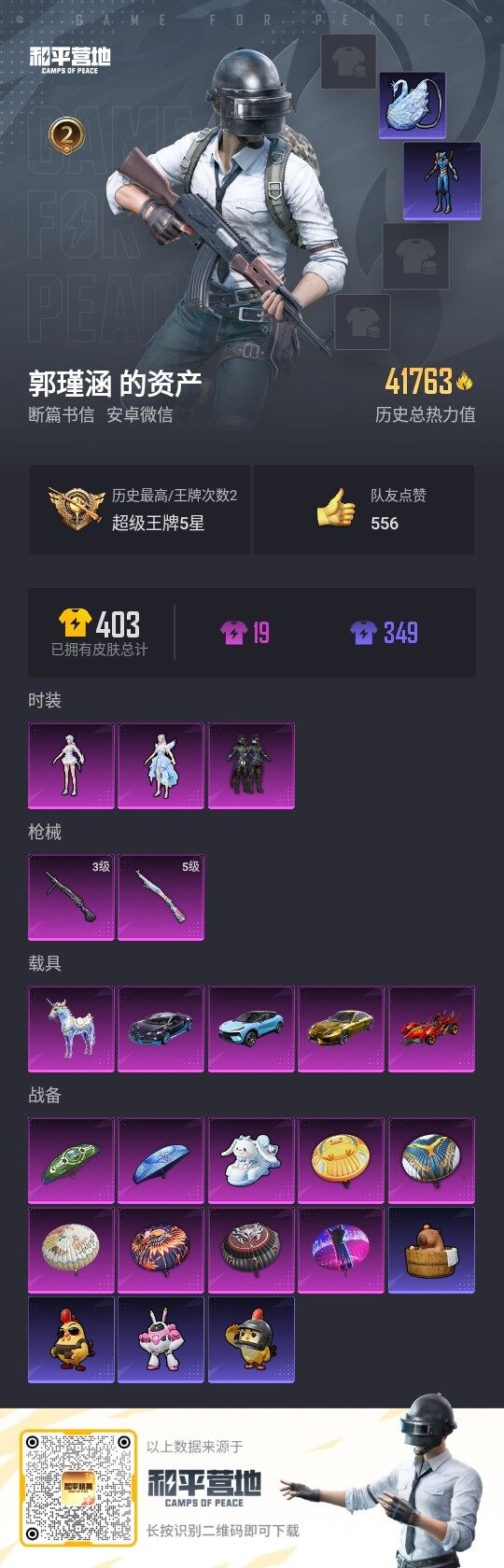 [17323390]安卓 微信-3粉装-2特效枪-5载具-1粉色飞行器-41763热力值-2王牌印记-99套装-103枪皮