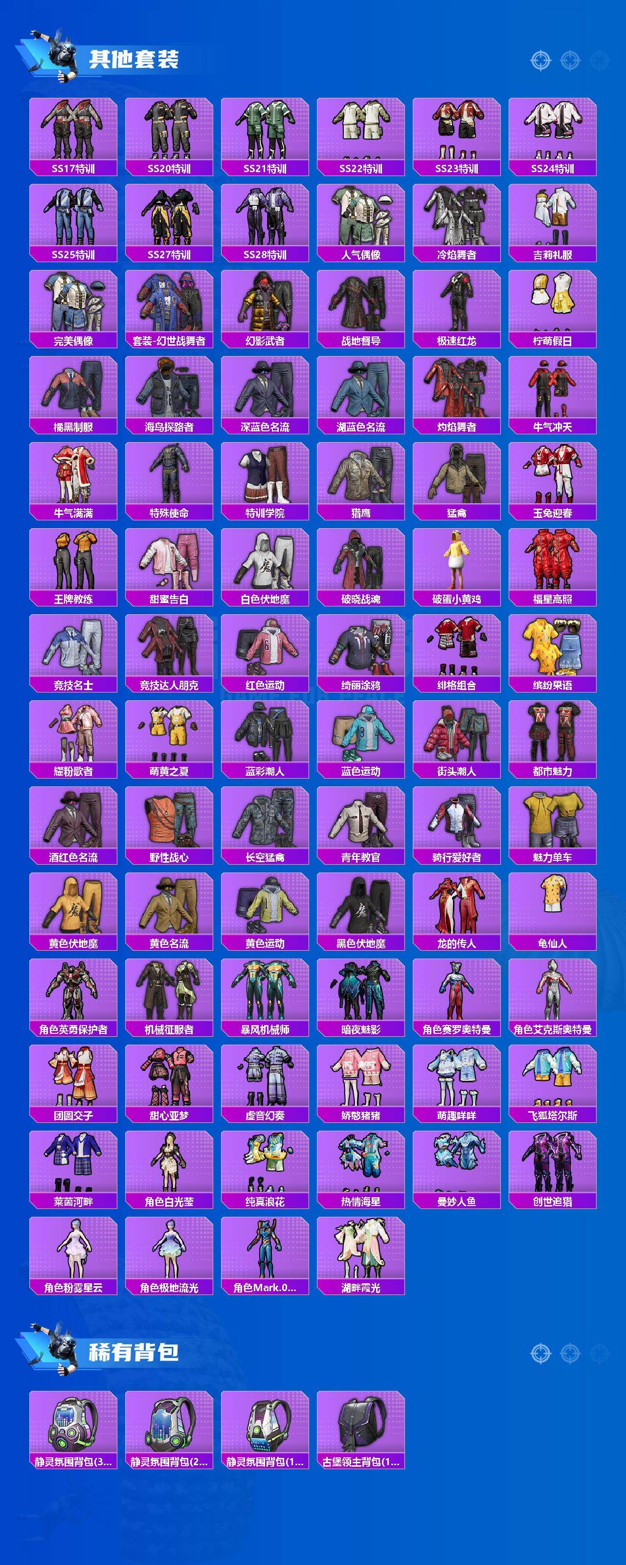 【稀有枪皮】:AKM-环太平洋,AKM-破晓战魂,AKM-虎虎生威,AKM-龙的传人,M16A4-甜心亚梦,SCAR-L-玉兔迎春,SCAR-L-红色方程式,M416-糯团青竹,M416-红色方程式,M416-蓝色火焰,AUG-天降萌叽,AUG-耀粉歌者,QBZ-彩虹符号,M762-天降萌叽,M762-牛气冲天,M762-瑞龙福将,M762-第五大道,G36C-时空追击者,G36C-暗夜玫瑰,AC-VAL-甜心亚梦,蜜獾-垂柳戏鸭,蜜獾-天降萌叽,蜜獾-娇憨猪猪,UZI-天降萌叽,UZI-娇憨猪猪,UZI-炫彩节奏,UZI-红色方程式,UMP45-夜灯,UMP45-生命誓言,UMP45-蓝色火焰,Vector-彩虹符号,Vector-暗夜玫瑰,Vector-生命誓言,Vector-创世·救赎,汤姆逊-天降萌叽,汤姆逊-环太平洋,野牛-机械英豪,Kar98K-彩虹符号,Kar98K-红色方程式,SKS-时空追击者,Mini14-梦幻火箭,Mini14-炫彩节奏,Win94-机械英豪,Win94-瑞龙福将,SLR-四圣焕新,SLR-娇憨猪猪,S686-生命誓言,S686-红色方程式,S1897-春暖花开,S1897-炫彩节奏,S12K-瑞龙福将,S12K-娇憨猪猪,S12K-幻世战舞者,DBS-彩虹符号,DBS-时空追击者,DBS-甜心亚梦,M249-古堡领主,DP-28-甜心亚梦,MG3-幻世战舞者,MG3-瑞龙福将