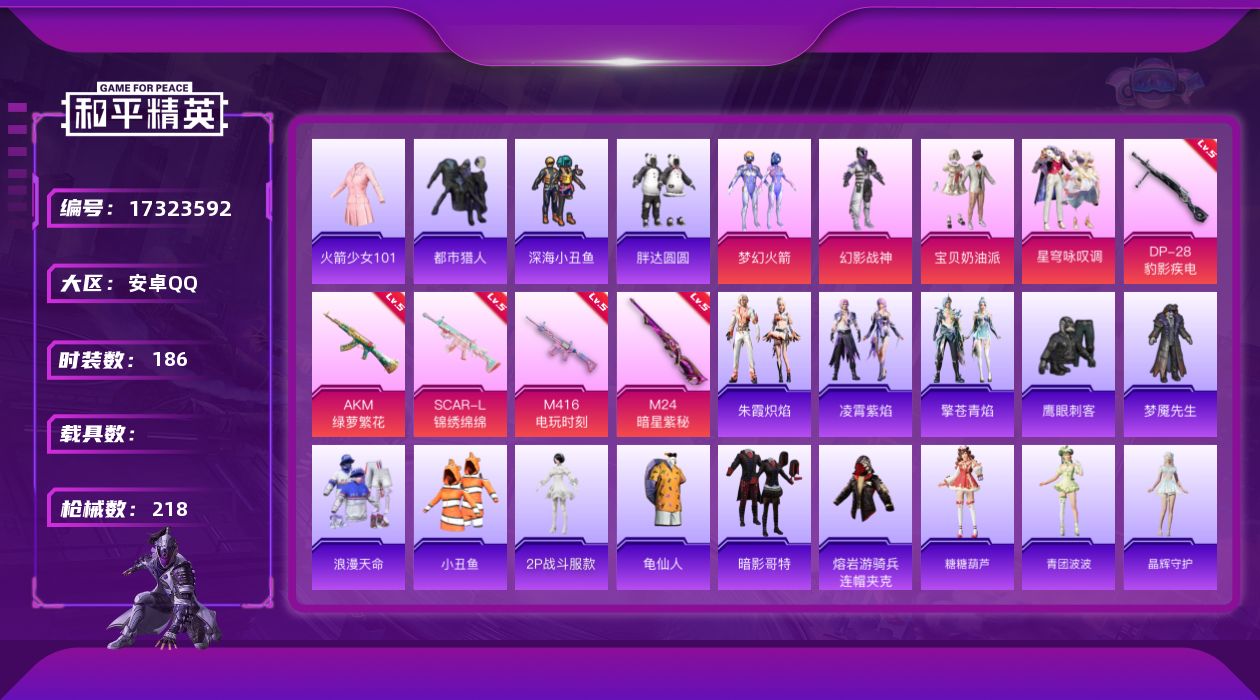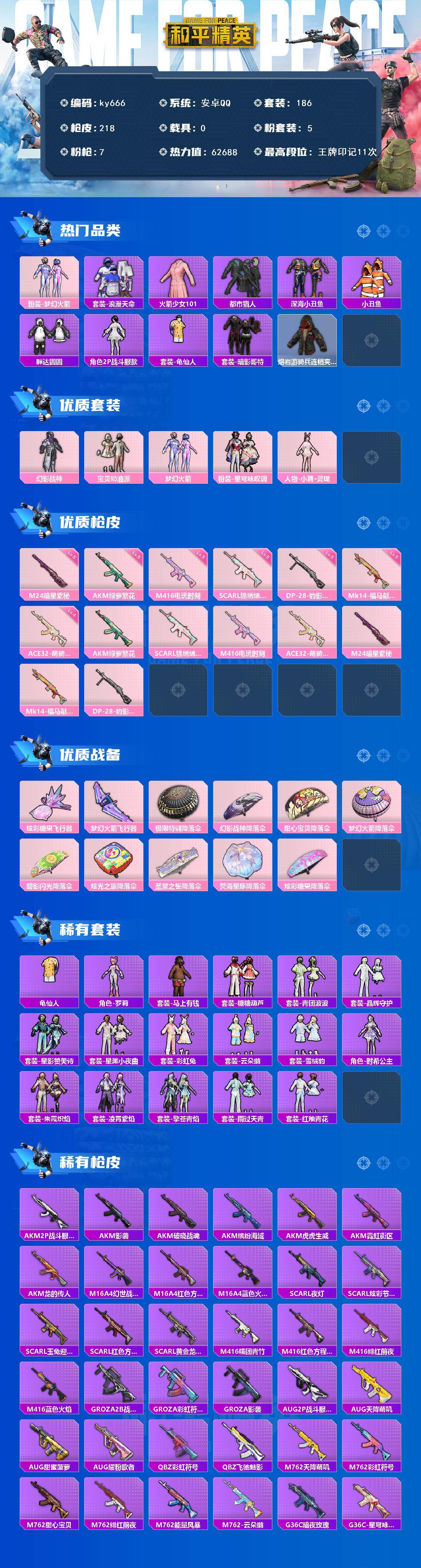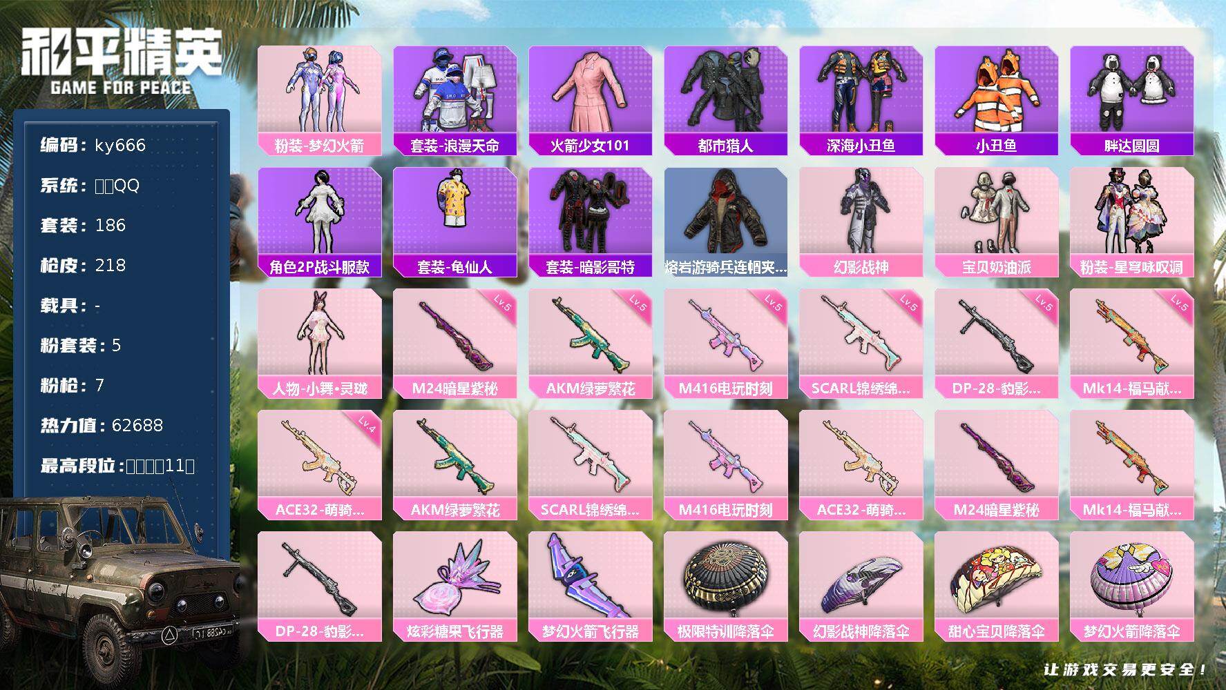 [17323592]安卓 手Q-5粉装-7特效枪-0载具-2粉色飞行器-62688热力值-11王牌印记-186套装-218枪皮