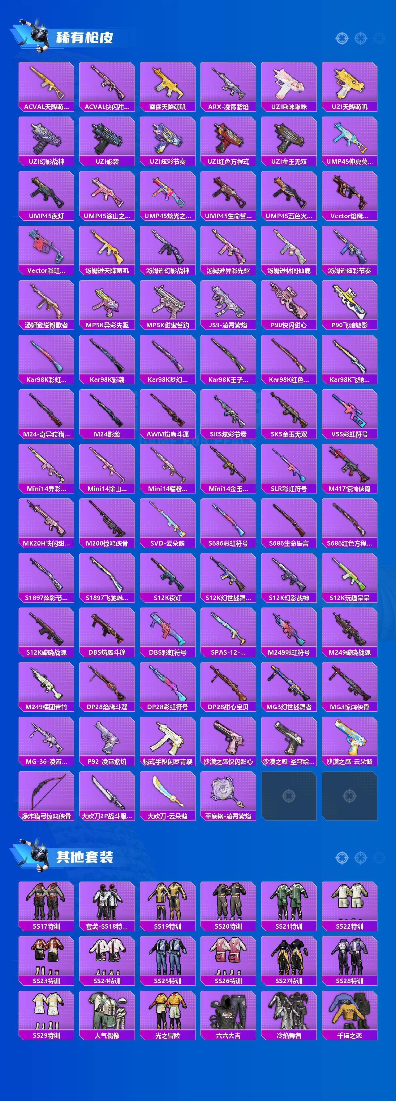【稀有枪皮】:AUG-冰晶雪宝,AKM-2P战斗服款,AKM-影袭,AKM-破晓战魂,AKM-缤纷海域,AKM-虎虎生威,AKM-霓虹街区,AKM-龙的传人,M16A4-幻世战舞者,M16A4-红色方程式,M16A4-蓝色火焰,SCAR-L-夜灯,SCAR-L-炫彩节奏,SCAR-L-玉兔迎春,SCAR-L-红色方程式,SCAR-L-黄金龙骨,M416-糯团青竹,M416-红色方程式,M416-绯红前夜,M416-蓝色火焰,GROZA-2B战斗服款,GROZA-彩虹符号,GROZA-影袭,AUG-2P战斗服款,AUG-天降萌叽,AUG-甜蜜菠萝,AUG-耀粉歌者,QBZ-彩虹符号,QBZ-飞驰魅影,M762-天降萌叽,M762-彩虹符号,M762-甜心宝贝,M762-绯红前夜,M762
