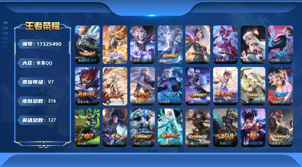 [17325490]【特价急出/详情看图】苹果Q-V7-永恒钻石V段位-127英雄-316皮肤-1典藏皮肤-2无双-3星元-1珍品传说-21传说-86史诗