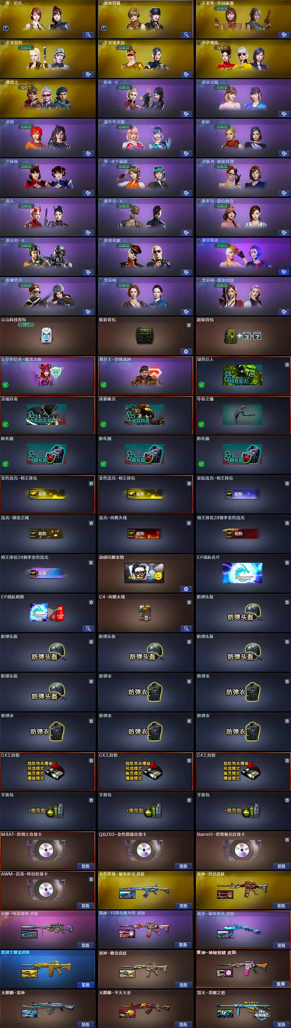 【道具】:云山科技背包,炫彩背包,超级背包,女皇终结者-魔龙之吻,救世主-黑桃战神,绿色巨人,灵魂忍者,迷雾幽灵,夺命之镰,防化服*3,金色流光-枪王排位*2,星辰流光-枪王排位,流光-鎏金之域,流光-再燃火线,枪王排位28赛季金色流光,枪王排位29赛季金色流光,动感闪耀表情,EP战队名片,EP战队喷图,C4-再燃火线,防弹