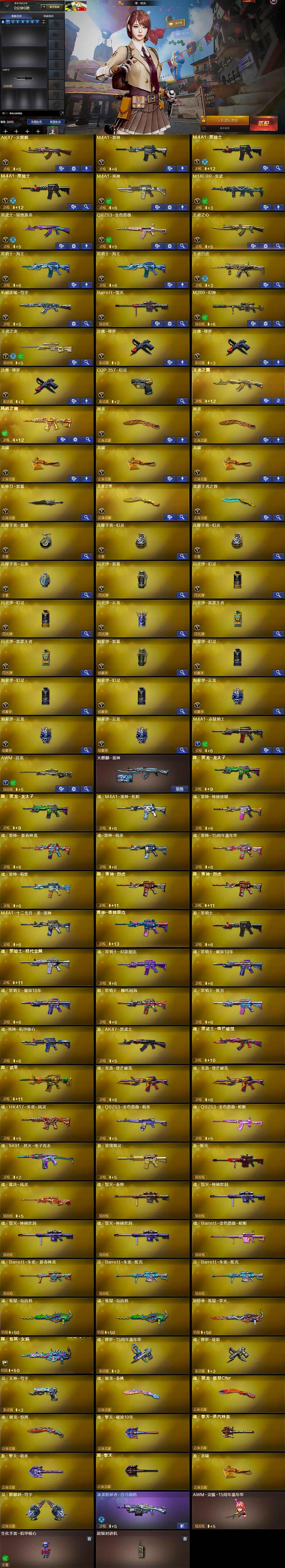 【英雄级武器】:AK47-火麒麟,M4A1-雷神,M4A1-黑骑士*2,M4A1-死神,M14EBR-玄武,黑武士-锦绣游龙,QBZ03-金色蔷薇,9A91-烈火,王者之心-觉醒版,黑骑士-海王*2,王者白虎-觉醒版,HK417-朱雀-电竞之星,机械迷城-穹宇,Barrett-毁灭,M200-幻神,王者之决-觉醒版,沙鹰-修罗*3,COP 357-幻灵,柯尔特-荣耀世冠EP,屠龙*2,龙啸*3,斩神刀-雷暴,王者之锋-觉醒版,雷霆王者之锋-觉醒版,高爆手雷-雷暴,高爆手雷-幻灵*2,高爆手雷-云龙,闪光弹-雷暴,闪光弹-幻灵*2,闪光弹-云龙,闪光弹-雷霆王者-觉醒版*2,烟雾弹-雷暴,烟雾弹-幻灵*3,烟雾弹-云龙*3,M4A1-赤狱骑士,AWM-昌龙