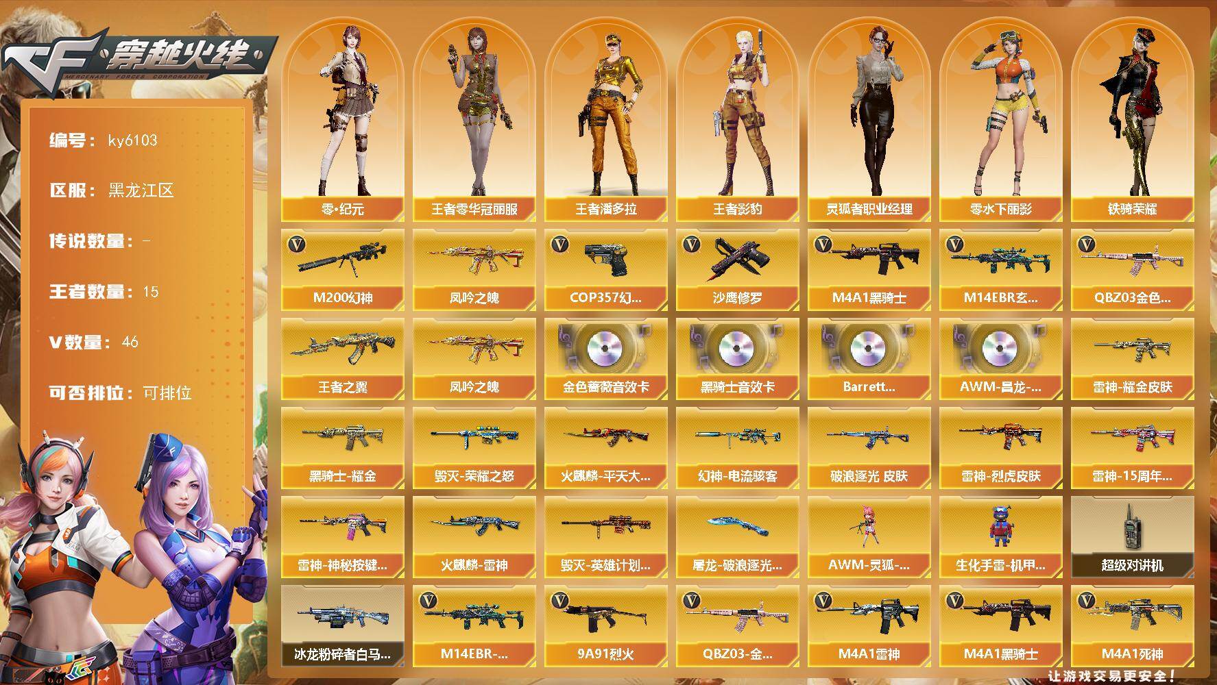 [17325478]黑龙江区-56V-15王者武器数-0炫金武器数 【热门武器】:QBZ03-金色蔷薇,M14EBR-玄武,M200-幻神,凤吟之魄,M4A1-黑骑士*2,COP 357-幻灵,沙鹰-修罗*3 【王者炫金武器】:王者之翼,凤吟之魄 【音效卡】:M4A1-黑骑士音效卡,QBZ03-金色蔷薇音效卡,Barrett-碧霄极光音效卡,AWM-昌龙-怀旧音效卡 【皮肤】:幻神-电流骇客 皮肤,金色蔷薇-破浪逐光 皮肤,雷神-耀金皮肤,雷神-烈虎皮肤,雷神-15周年嘉年华 皮肤,雷神-神秘按键 皮肤,火麒麟-雷神,火麒麟-平天大圣,毁灭-荣耀之怒,毁灭-英雄计划 皮肤,黑骑士耀金皮肤,屠龙-破浪逐光 皮肤 【角色】:零·纪元,战地猎狐,王者零-华冠丽服,王者影豹,王者潘多拉,乔伊教练,修道士,暗夜-X,初恋灵狐,虎妞,嘉年华灵狐,娟娟,兰妹妹,零-水下丽影,灵狐者-职业经理,龙儿,潘多拉-X,潘多拉-甜心教官,斯沃特-X,铁骑荣耀,兔囡囡,新灵狐者,新娜塔莎,雪莉杨,雪莉杨-摸金校尉 【人偶武器】:AWM-灵狐-15周年嘉年华,生化手雷-机甲核心 【暴走生化】:超级对讲机 【挑战大师】:冰龙粉碎者-白马银枪 【英雄级武器】:AK47-火麒麟,M4A1-雷神,M4A1-黑骑士*2,M4A1-死神,M14EBR-玄武,黑武士-锦绣游龙,QBZ03-金色蔷薇,9A91-烈火,王者之心-觉醒版,黑骑士-海王*2,王者白虎-觉醒版,HK417-朱雀-电竞之星,机械迷城-穹宇,Barrett-毁灭,M200-幻神,王者之决-觉醒版,沙鹰-修罗*3,COP 357-幻灵,柯尔特-荣耀世冠EP,屠龙*2,龙啸*3,斩神刀-雷暴,王者之锋-觉醒版,雷霆王者之锋-觉醒版,高爆手雷-雷暴,高爆手雷-幻灵*2,高爆手雷-云龙,闪光弹-雷暴,闪光弹-幻灵*2,闪光弹-云龙,闪光弹-雷霆王者-觉醒版*2,烟雾弹-雷暴,烟雾弹-幻灵*3,烟雾弹-云龙*3,M4A1-赤狱骑士,AWM-昌龙 【道具】:云山科技背包,炫彩背包,超级背包,女皇终结者-魔龙之吻,救世主-黑桃战神,绿色巨人,灵魂忍者,迷雾幽灵,夺命之镰,防化服*3,金色流光-枪王排位*2,星辰流光-枪王排位,流光-鎏金之域,流光-再燃火线,枪王排位28赛季金色流光,枪王排位29赛季金色流光,动感闪耀表情,EP战队名片,EP战队喷图,C4-再燃火线,防弹