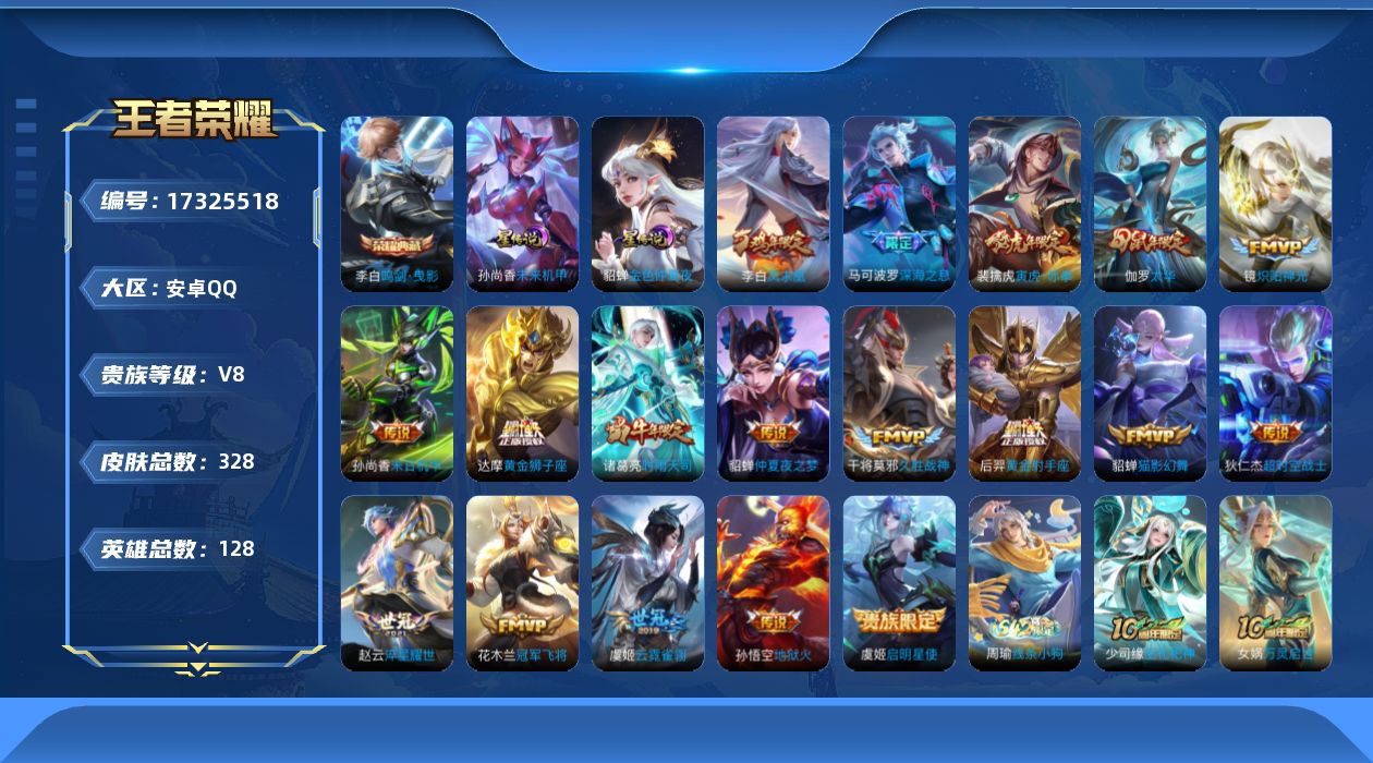 [17325518]【店主推荐捡漏号!可直接换绑】安卓Q-V8-永恒钻石IV段位36段打野-128英雄-328皮肤-1典藏皮肤-18传说-94史诗-3星元