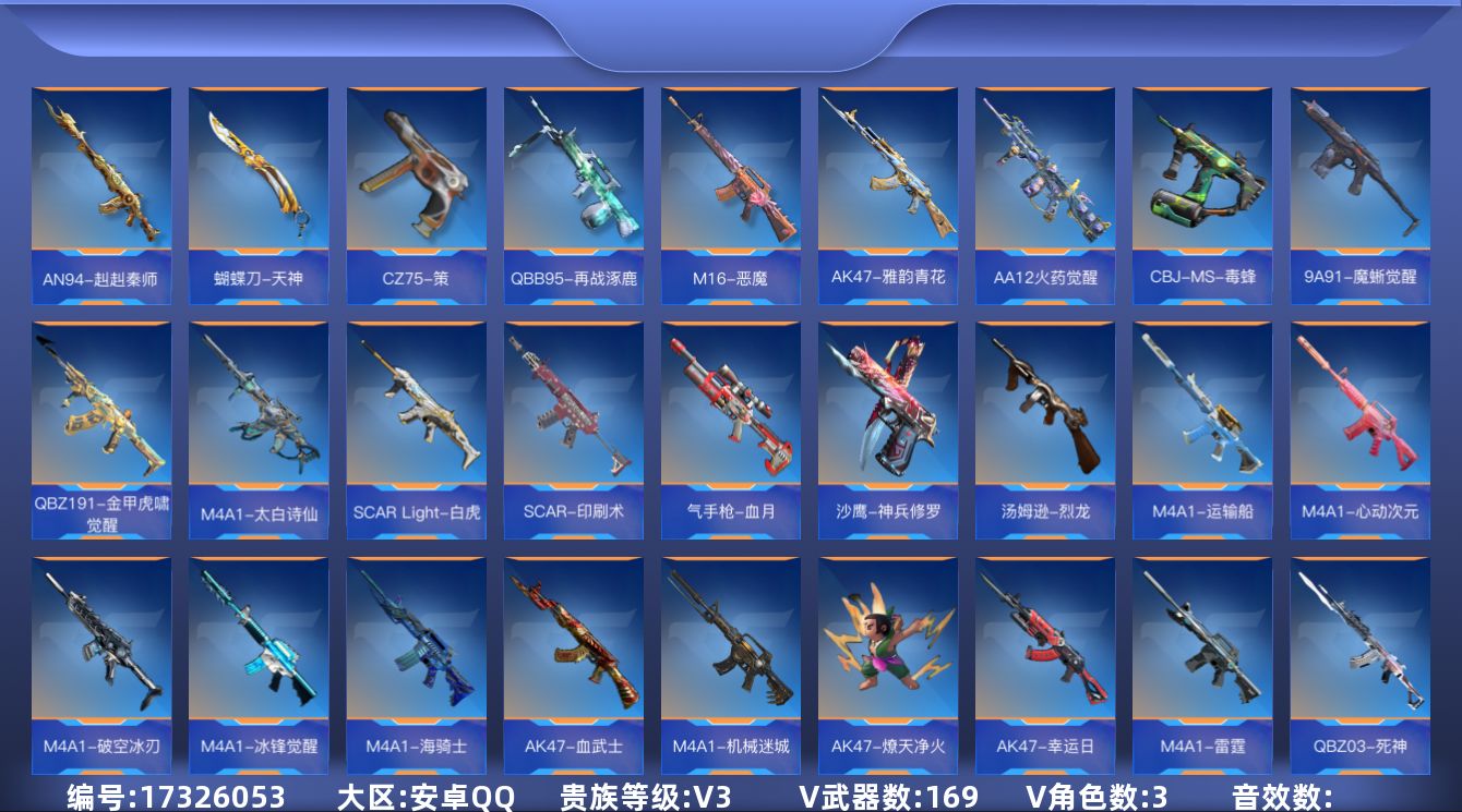 [17326053]【LXYX1】VIP3/169V/王者之烈/81式-阿波罗/樱/炽天使-X/零-新生/AK47-无影/AK47-火麒麟/AK47-幸运日/AK47-燎天净火/AK47-血武士/AK47-黑鲨/AK47-木兰/AK47-雅韵青花/AK47-谜城烟火/M4A1-雷神/M4A1-死神/M4A1-玫瑰精灵/M4A1-樱龙·一觉/M4A1-龙血/M4A1-机械迷城/M4A1-雷霆/M4A1-海骑士/M4A1-冰锋觉醒/M4A1-破空冰刃/M4A1-心动次元/M4A1-运输船/M4A1-猎神/M4A1-太白诗仙/SCAR-幽暗骑士觉醒/SCAR Light-白虎/SCAR-印刷术/SCAR-心动PICK/剑齿虎-炫彩/AN94-赳赳秦师/9A91-魔蜥觉醒/M14EBR-暗夜/M16-恶魔/AK12-天启/QBZ03-湮灭/QBZ03-金色蔷薇/QBZ03-死神/QBZ191-金甲虎啸 觉醒/QBZ191-封神榜/AWM-天龙/AWM-天使/AWM-指南针觉醒/AWM-指南针/巴雷特-毁灭/巴雷特-极光/98K-星神/RPK-盘龙/加特林-堡垒/加特林-堡垒觉醒/刘易斯-天使/QBB95-极光/QBB95-再战涿鹿/MK5-极光/汤姆逊-烈龙/双持斯泰尔-天使/CBJ-MS-毒蜂/CZS2-心动次元/CZS2-血月/打击者-天神/地狱火/地狱烈炎/AA12火药觉醒/USP-神罚/USP-机械迷城/USP-太白诗仙/沙鹰-修罗/气手枪-血月/沙鹰-神兵修罗/沙鹰-宇航兔兔/蟒蛇-鼓龙/双持GLOCK18-本初/QSZ92-天使/QSZ92-华夏传说/双管猎枪-威侯/CZ75-策/掠夺者P365-虹舞/蝴蝶刀-天神/女皇利刃-铁胆虎魄/龙啸/神罚战斧/血阳/手斧-机械迷城/屠龙/血月/麒麟刺/马来剑-毁灭/唐刀-华夏传说/擎天/双截棍-天使/斩魔刀/破邪蛇棍觉醒/马来剑-耀金伯爵/火麒麟手雷/高爆手雷-无限/王者之心闪光弹/火麒麟闪光弹/竞技战魂闪光弹/王者之竞闪光弹/王者之心烟雾弹/王者之势烟雾弹/竞技战魂烟雾弹