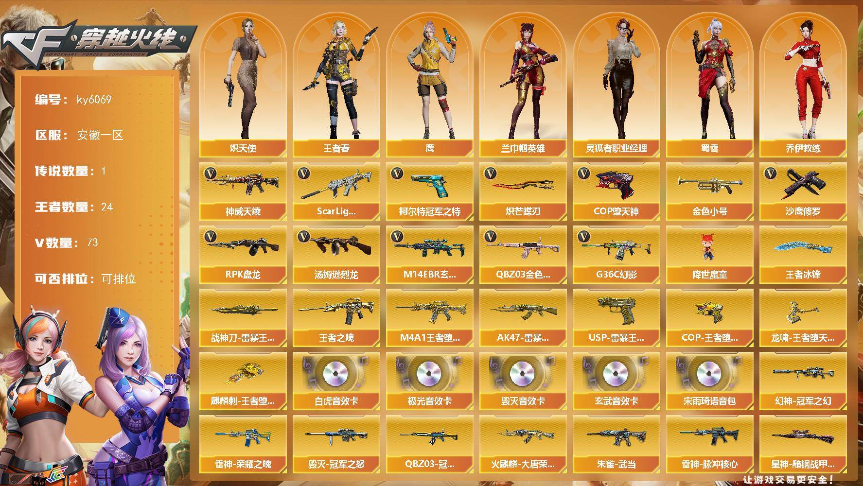 [17326545]安徽一区-79V-24王者武器数-0炫金武器数 【传说武器】:神威天绫 【传说角色】:神威莲华 【热门武器】:G36C-幻影,QBZ03-金色蔷薇,M14EBR-玄武,Scar Light-白虎,柯尔特-冠军之特,金色小号,汤姆逊-烈龙*6,RPK-盘龙*4,降世魔童,COP-堕天神,沙鹰-修罗,炽芒蝶刃*3 【王者炫金武器】:王者之魄,AK47-雷暴王者,M4A1-王者堕天神,USP-雷暴王者,COP-王者堕天神*2,斩神刀-雷暴王者,龙啸-王者堕天神,麒麟刺-王者堕天神,王者冰锋 【音效卡】:Barrett-毁灭音效卡,Barrett-极光音效卡,Scar Light-白虎音效卡,宋雨琦语音包,M14EBR-玄武音效卡 【皮肤】:幻神-冠军之幻,白虎-量子聚变 皮肤,QBZ03-冠军之薇,QBZ03-巅峰荣耀皮肤,金色蔷薇-破浪逐光 皮肤,裁决-量子聚变 皮肤,星神-黯钢战甲 皮肤,雷神-荣耀之魄,雷神-脉冲核心,火麒麟-大唐荣光,毁灭-冠军之怒,无影-暗月,无影-华夏传说 皮肤,超新星-傲竹金蛇 皮肤,HK417-朱雀-武当,HK417-朱雀-量子聚变 皮肤,幻影-量子聚变 皮肤,玄武-量子聚变 皮肤,极光-掌火灵耀 皮肤,炼狱-酷酷小狮,屠龙-星耀 皮肤,屠龙-破浪逐光 皮肤,龙啸-黯钢战甲 皮肤,擎天-傲竹金蛇 皮肤,麒麟刺-甜蜜糖果 皮肤 【角色】:鹰,兰-巾帼英雄,智,王者春,乔伊教练,修道士,云海玲珑,宋雨琦,炽天使,飞虎队-X,娟娟,兰-新年限定,灵狐者-职业经理,潘多拉-甜心教官,蜀雪,兔囡囡,新娜塔莎 【人偶武器】:迷你宝贝,Scar Light-马枪,M37-葵,迷你牛牛,深渊终结者手雷,雷神-研,降世魔童 【挑战大师】:AK47-冰龙粉碎者 【英雄级武器】:AK47-火麒麟,AK47-无影,AN94-超新星,Scar Light-白虎,M14EBR-玄武,QBZ03-天罚,M4A1-神工天巧,G36C-幻影,M4A1-玫瑰精灵,QBZ03-金色蔷薇,M4A1-猎神,9A91-烈火,加利尔ACE-天袭,Barrett-毁灭,Barrett-极光,AWM-裁决,Barrett-金色蔷薇,Kar98K-量子之心,RPK-盘龙*4,汤姆逊-烈龙*6,沙鹰-修罗,COP-堕天神,柯尔特-冠军之特,USP-神工天巧,Anaconda-量子之心,屠龙,