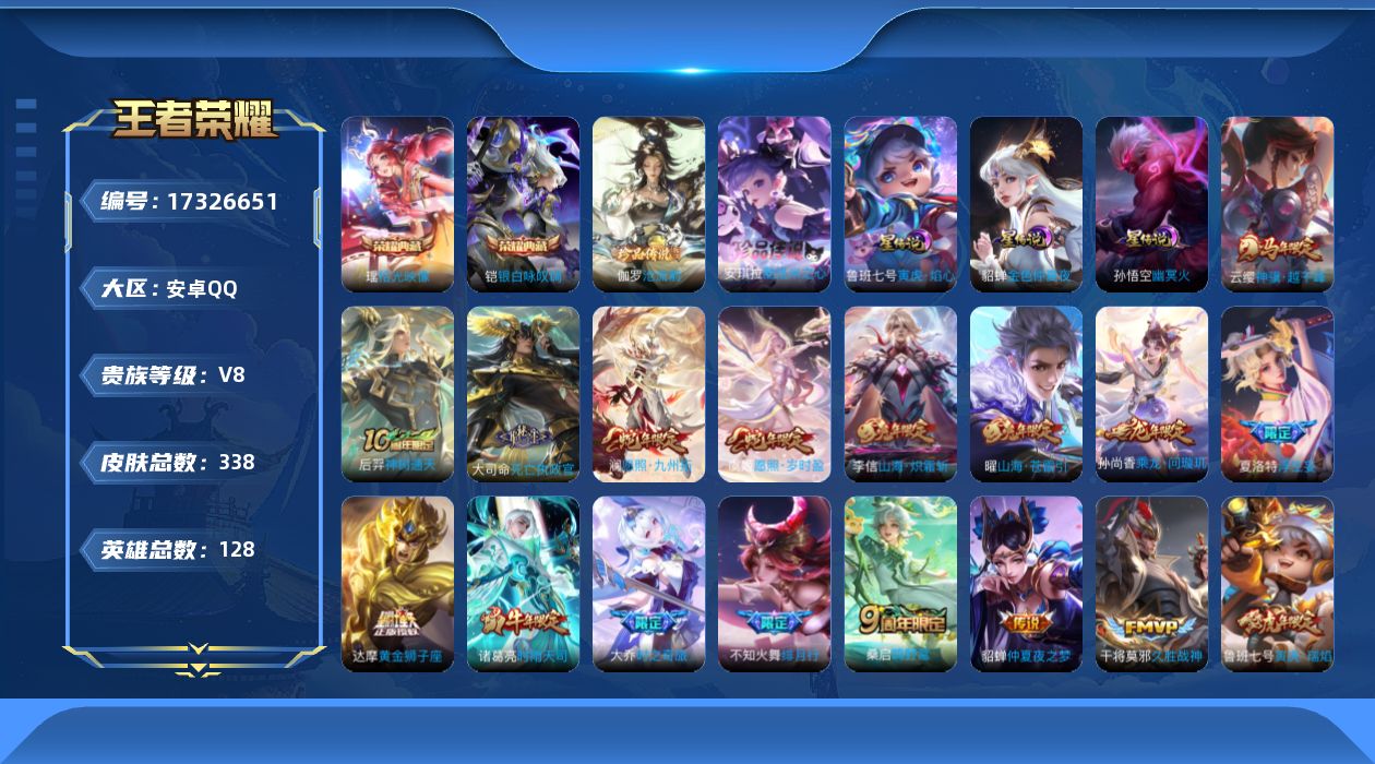[17326651]可二次【特价出售/店主推荐】安卓Q-V8-至尊星耀V段位-128英雄-338皮肤-2典藏皮肤-2珍品传说-3星传说-25传说-111史诗
