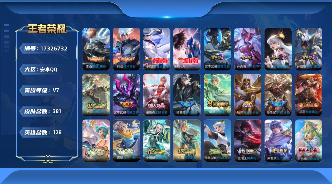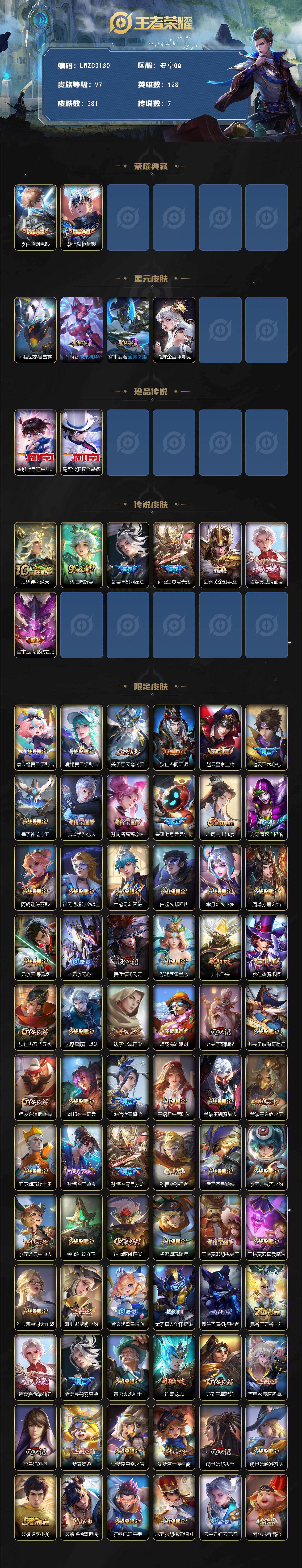 [17326732]【特价出售/店主推荐】:安卓Q-V7-最强王者段位-128英雄-381皮肤-2典藏皮肤-2珍品传说-7传说-4星元传说-111史诗