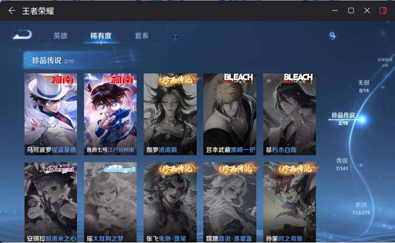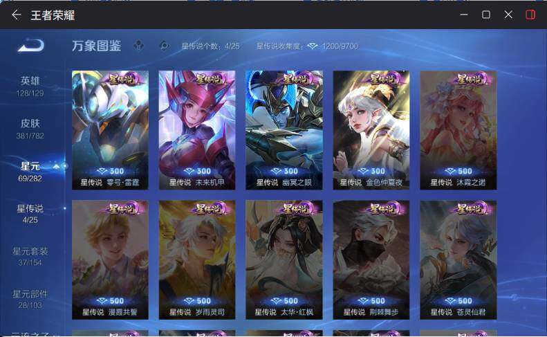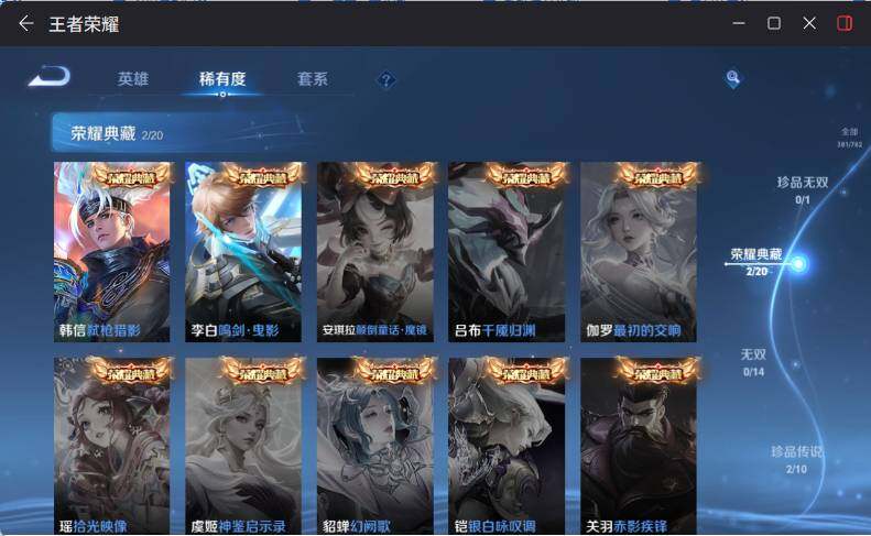 夏侯惇朔风刀,明世隐疑决卦,老夫子醍醐杖,鬼谷子原初探秘者,狄仁杰万华元夜,程咬金演武夺筹,钟馗驱傩正仪,苏烈千军破阵,钟馗神迹守卫,沈梦溪星空之诺,李元芳银河之约,刘邦夺宝奇兵,蒙犽狂想玩偶喵,元歌云间偶戏,弈星混沌棋,达摩沙漠行僧,兰陵王金庭之子,沈梦溪大漠名商,李元芳云中旅人,桑启海盐诗旅,裴擒虎擒涛扼浪,鲁班大师探海日志,张良古海寻踪,项羽苍威无极,镜青焰无极