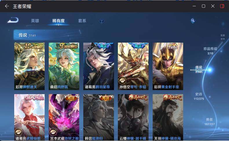 【传说皮肤】:后羿神树通天,桑启鸣野蒿,诸葛亮鹤羽星尊,孙悟空零号赤焰,后羿黄金射手座,诸葛亮武陵仙君,宫本武藏地狱之眼