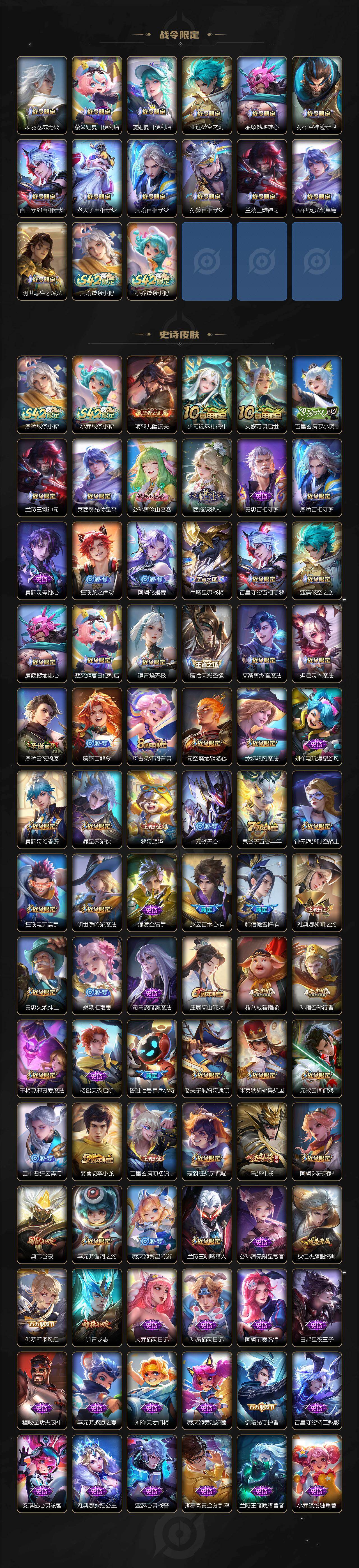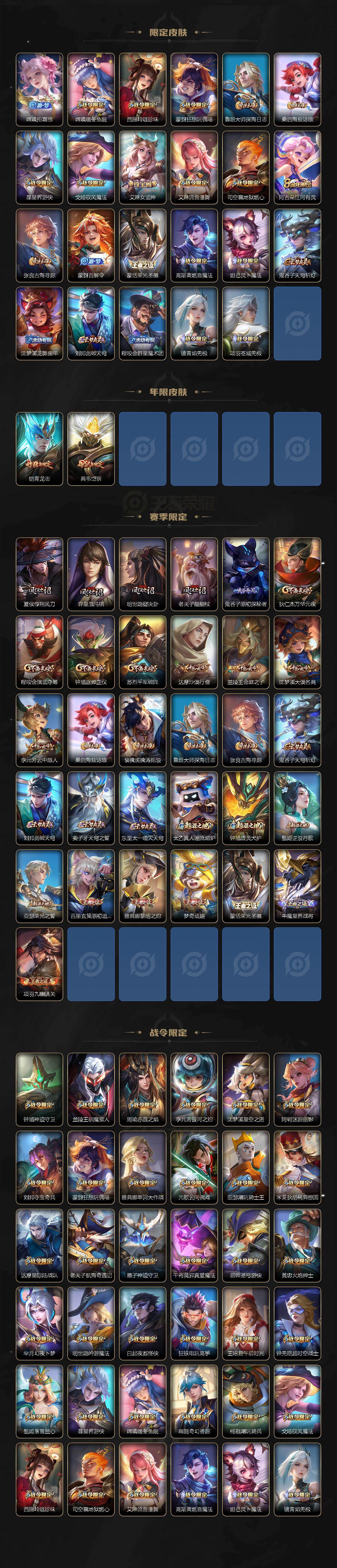 【限定皮肤】:蔡文姬夏日便利店,虞姬夏日便利店,姜子牙天穹之誓,狄仁杰阴阳师,赵云皇家上将,赵云百木心枪,墨子神迹守卫,嬴政优雅恋人,孙尚香蔷薇恋人,鲁班七号乒乒小将,庄周高山流水,高渐离死亡摇滚,阿轲迷踪丽影,钟无艳超时空战士,扁鹊奇幻香踪,白起夜都怪侠,芈月幻夜卜梦,周瑜赤莲之焰,元歌云间偶戏,元歌无心,夏侯惇朔风刀,甄姬落雪兰心,典韦岱宗,狄仁杰魔术师,狄仁杰万华元夜,达摩星际陆战队,达摩沙漠行僧,项羽海滩派对,老夫子醍醐杖,老夫子航海奇遇记,程咬金演武夺筹,刘邦夺宝奇兵,韩信傲雪梅枪,王昭君午后时光,兰陵王驯魔猎人,兰陵王金庭之子,亚瑟潮玩骑士王,孙悟空至尊宝,孙悟空零号赤焰,孙悟空孙行者,后羿圣弓游侠,李元芳银河之约,李元芳云中旅人,钟馗神迹守卫,钟馗驱傩正仪,杨戬潮玩骑兵,干将莫邪胡桃夹子,干将莫邪真爱魔法,雅典娜单词大作战,雅典娜黎明之约,蔡文姬繁星吟游,太乙真人华丽摇滚,鬼谷子原初探秘者,鬼谷子五谷丰年,诸葛亮武陵仙君,诸葛亮鹤羽星尊,黄忠火炮绅士,铠青龙志,苏烈千军破阵,百里玄策原初追逐者,弈星混沌棋,梦奇顽趣,沈梦溪星空之诺,沈梦溪大漠名商,明世隐疑决卦,明世隐吟游魔法,裴擒虎李小龙,裴擒虎擒涛扼浪,狂铁电玩高手,米莱狄胡桃异想国,云中君纤云弄巧,猪八戒猪悟能,嫦娥拒霜思,嫦娥暖冬兔眠,西施玲珑珍味,蒙犽狂想玩偶喵,鲁班大师探海日志,桑启海盐诗旅,暃星界游侠,戈娅驭风魔法,艾琳女武神,艾琳流音漫舞,司空震地狱燃心,阿古朵江河有灵,张良古海寻踪,蒙犽百解令,蒙恬荣光圣徽,高渐离燃音魔法,妲己灵卜魔法,鬼谷子天穹祈灯,沈梦溪龙舞盛年,刘邦剑破天穹,程咬金群星魔术团,镜青焰无极,项羽苍威无极