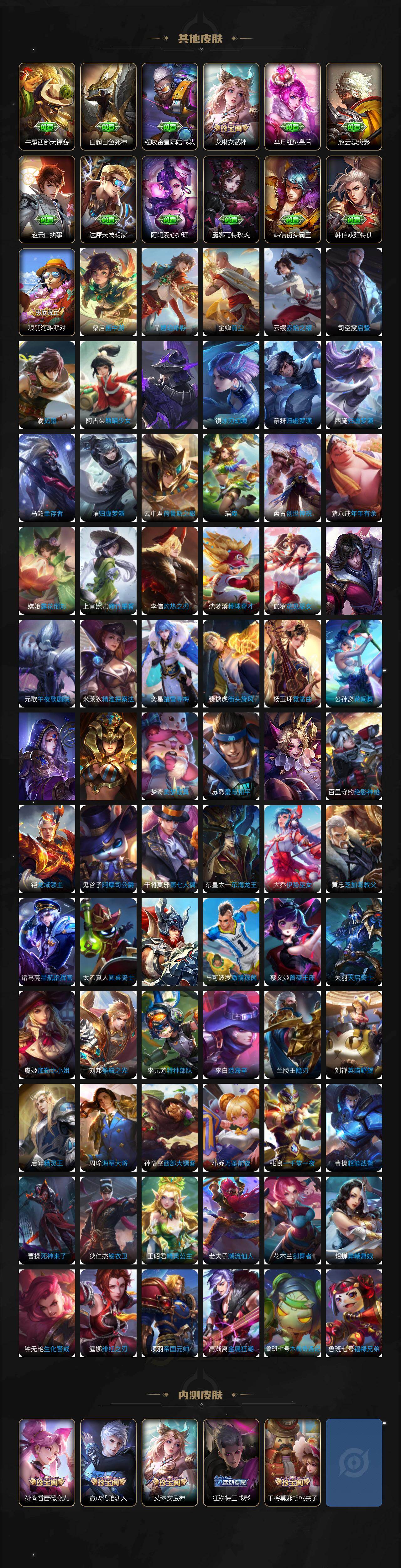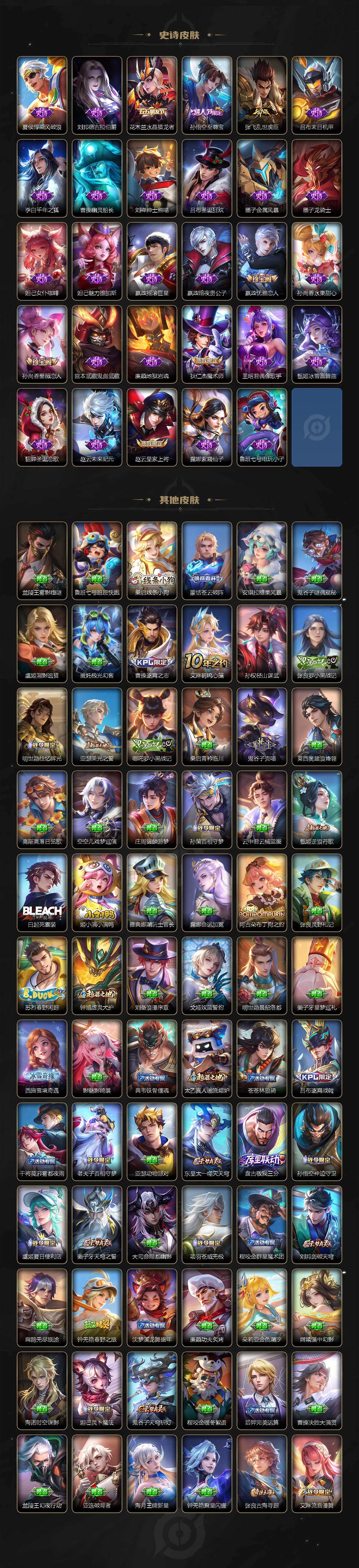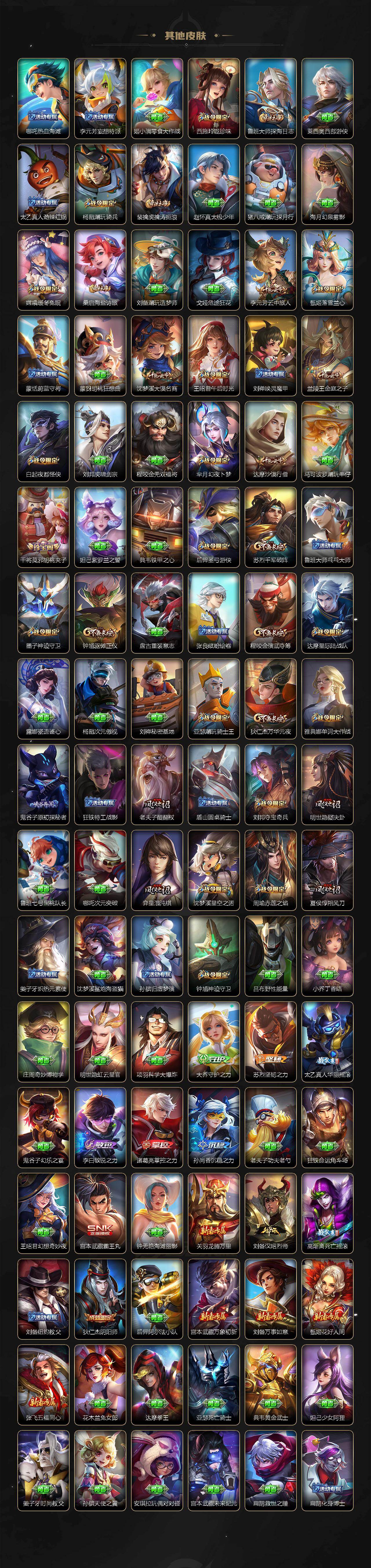 伽罗箭羽风息,李元芳逐浪之夏,公孙离无限星赏官,大乔猫狗日记,孙策猫狗日记,阿轲节奏热浪,露娜紫霞仙子,诸葛亮黄金分割率,王昭君偶像歌手,雅典娜冰冠公主,吕布末日机甲,鲁班七号电玩小子,墨子龙骑士,嬴政摇滚巨星,刘禅绅士熊喵,刘禅天才门将,白起星夜王子,安琪拉心灵骇客,程咬金功夫厨神,刘邦德古拉伯爵,兰陵王暗隐猎兽者,曹操幽灵船长,宫本武藏鬼剑武藏,司马懿暗渊魔法,亚瑟心灵战警,杨戬天秀·启明,蔡文姬舞动绿茵,廉颇地狱岩魂,小乔缤纷独角兽,夏侯惇乘风破浪,花木兰水晶猎龙者,铠曙光守护者,墨子金属风暴,百里玄策原初追逐者,吕布圣诞狂欢,貂蝉圣诞恋歌,百里守约特工魅影,嬴政暗夜贵公子,嫦娥拒霜思,雅典娜黎明之约,李白千年之狐,澜赏金猎手,刘禅电玩·爆裂旋风,蒙犽百解令,周瑜雪夜绮愿,高渐离燃音魔法