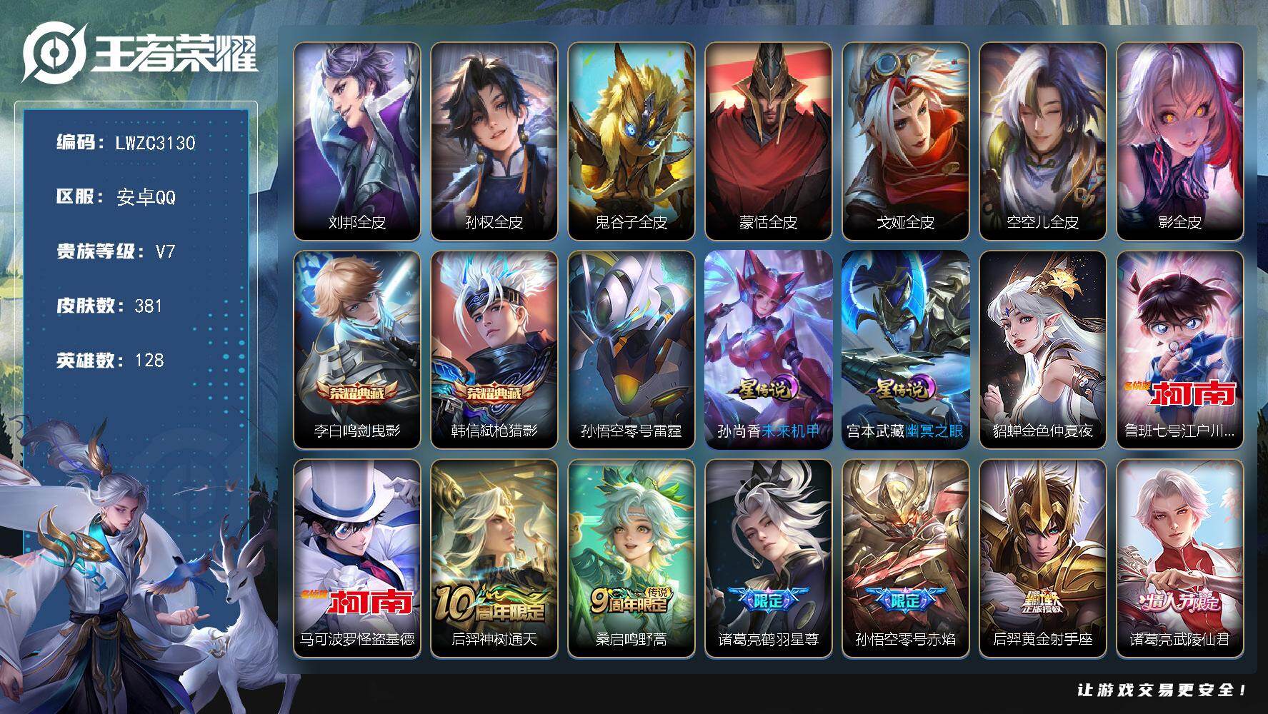[17326732]【特价出售/店主推荐】:安卓Q-V7-最强王者段位-128英雄-381皮肤-2典藏皮肤-2珍品传说-7传说-4星元传说-111史诗 【英雄全皮】:刘邦全皮,孙权全皮,鬼谷子全皮,蒙恬全皮,戈娅全皮,空空儿全皮,影全皮 【荣耀典藏】:李白鸣剑曳影,韩信弑枪猎影 【珍品传说】:鲁班七号江户川柯南,马可波罗怪盗基德 【传说皮肤】:后羿神树通天,桑启鸣野蒿,诸葛亮鹤羽星尊,孙悟空零号赤焰,后羿黄金射手座,诸葛亮武陵仙君,宫本武藏地狱之眼 【限定皮肤】:蔡文姬夏日便利店,虞姬夏日便利店,姜子牙天穹之誓,狄仁杰阴阳师,赵云皇家上将,赵云百木心枪,墨子神迹守卫,嬴政优雅恋人,孙尚香蔷薇恋人,鲁班七号乒乒小将,庄周高山流水,高渐离死亡摇滚,阿轲迷踪丽影,钟无艳超时空战士,扁鹊奇幻香踪,白起夜都怪侠,芈月幻夜卜梦,周瑜赤莲之焰,元歌云间偶戏,元歌无心,夏侯惇朔风刀,甄姬落雪兰心,典韦岱宗,狄仁杰魔术师,狄仁杰万华元夜,达摩星际陆战队,达摩沙漠行僧,项羽海滩派对,老夫子醍醐杖,老夫子航海奇遇记,程咬金演武夺筹,刘邦夺宝奇兵,韩信傲雪梅枪,王昭君午后时光,兰陵王驯魔猎人,兰陵王金庭之子,亚瑟潮玩骑士王,孙悟空至尊宝,孙悟空零号赤焰,孙悟空孙行者,后羿圣弓游侠,李元芳银河之约,李元芳云中旅人,钟馗神迹守卫,钟馗驱傩正仪,杨戬潮玩骑兵,干将莫邪胡桃夹子,干将莫邪真爱魔法,雅典娜单词大作战,雅典娜黎明之约,蔡文姬繁星吟游,太乙真人华丽摇滚,鬼谷子原初探秘者,鬼谷子五谷丰年,诸葛亮武陵仙君,诸葛亮鹤羽星尊,黄忠火炮绅士,铠青龙志,苏烈千军破阵,百里玄策原初追逐者,弈星混沌棋,梦奇顽趣,沈梦溪星空之诺,沈梦溪大漠名商,明世隐疑决卦,明世隐吟游魔法,裴擒虎李小龙,裴擒虎擒涛扼浪,狂铁电玩高手,米莱狄胡桃异想国,云中君纤云弄巧,猪八戒猪悟能,嫦娥拒霜思,嫦娥暖冬兔眠,西施玲珑珍味,蒙犽狂想玩偶喵,鲁班大师探海日志,桑启海盐诗旅,暃星界游侠,戈娅驭风魔法,艾琳女武神,艾琳流音漫舞,司空震地狱燃心,阿古朵江河有灵,张良古海寻踪,蒙犽百解令,蒙恬荣光圣徽,高渐离燃音魔法,妲己灵卜魔法,鬼谷子天穹祈灯,沈梦溪龙舞盛年,刘邦剑破天穹,程咬金群星魔术团,镜青焰无极,项羽苍威无极 【年限皮肤】:铠青龙志,典韦岱宗 【赛季限定】:夏侯惇朔风刀,弈星混沌棋,明世隐疑决卦,老夫子醍醐杖,鬼谷子原初探秘者,狄仁杰万华元夜