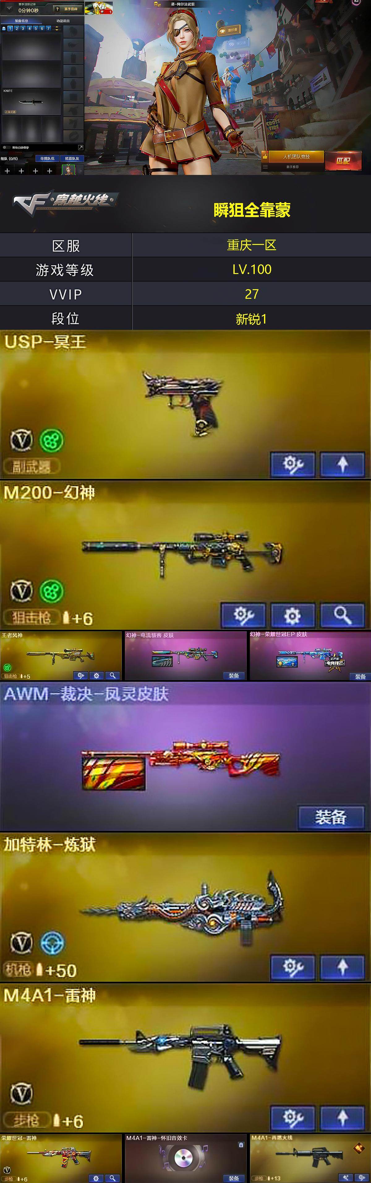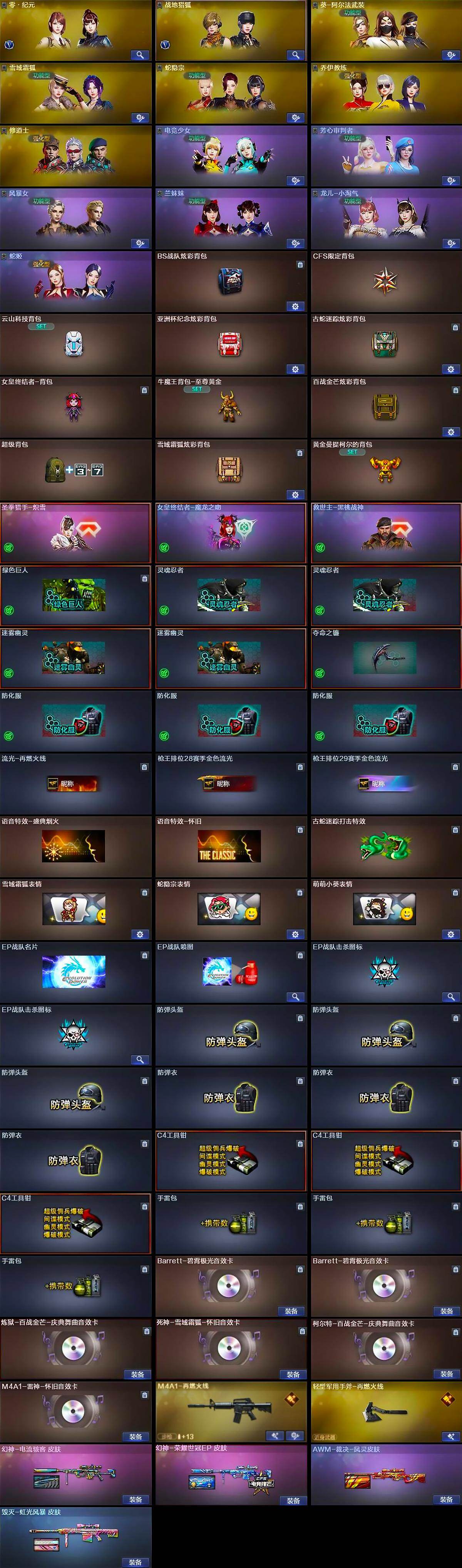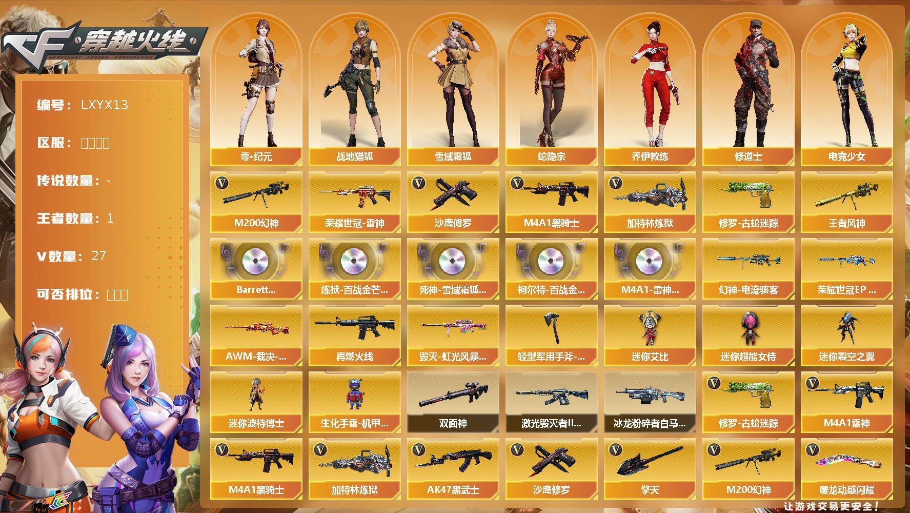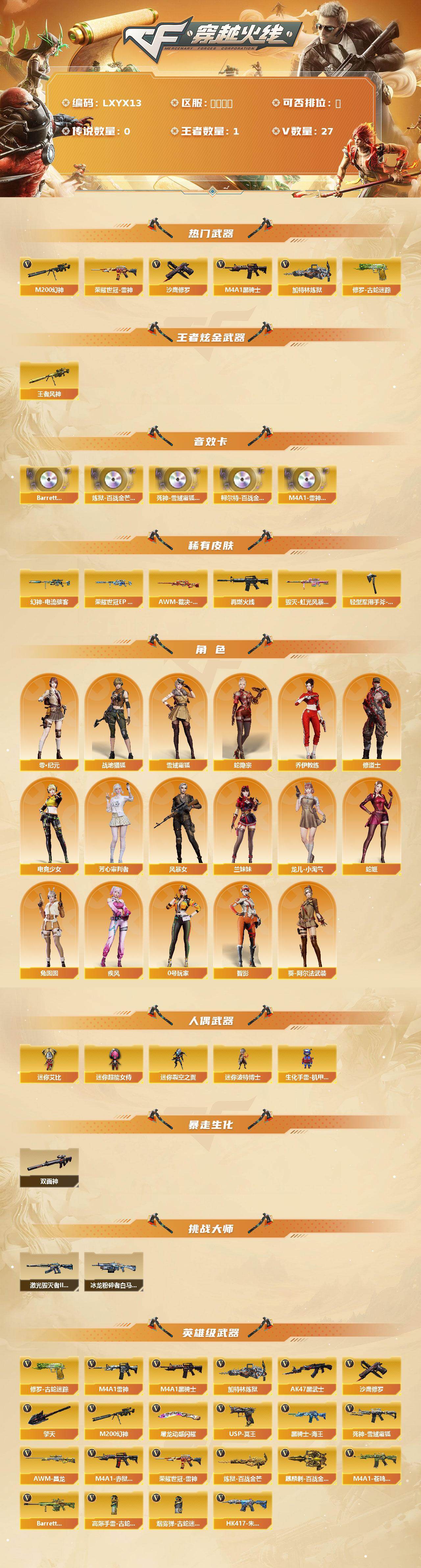 [17327103]【LXYX13】23V/100级/元帅/1王者/4英雄/M200-幻神/修罗-古蛇迷踪/雷神-荣耀世冠/M4A1-黑骑士/加特林-炼狱/沙鹰-修罗/王者风神/Barrett-碧霄极光音效卡/炼狱-百战金芒-庆典舞曲音效卡/死神-雪域霜狐-怀旧音效卡/柯尔特-百战金芒-庆典舞曲音效卡/M4A1-雷神-怀旧音效卡/幻神-电流骇客/幻神-荣耀世冠EP 皮肤/AWM-裁决-凤灵皮肤/M4A1-再燃火线/毁灭-虹光风暴 皮肤/轻型军用手斧-再燃火线/零·纪元/战地猎狐/雪域霜狐/蛇隐宗/乔伊教练/修道士/葵-阿尔法武装/电竞少女/芳心审判者/风暴女/疾风/兰妹妹/0号玩家/龙儿-小淘气/蛇姬/兔囡囡/智影/迷你裂空之翼/迷你波特博士/生化手雷-机甲核心/迷你艾比/迷你超能女侍/双面神/冰龙粉碎者-白马银枪/激光毁灭者III-白马银枪/M4A1-雷神/AK47-黑武士/死神-雪域霜狐/黑骑士-海王/HK417-朱雀-电竞之星/机械迷城-穹宇/炼狱-百战金芒/USP-冥王/擎天/屠龙-动感闪耀/麒麟刺-百战金芒/高爆手雷-古蛇迷踪/烟雾弹-古蛇迷踪/M4A1-赤狱骑士/M4A1-苍鸣雷神/AWM-昌龙/Barrett-碧霄极光/BS战队炫彩背包/CFS限定背包/云山科技背包/亚洲杯纪念炫彩背包/古蛇迷踪炫彩背包/女皇终结者-背包/牛魔王背包-至尊黄金/百战金芒炫彩背包/超级背包/雪域霜狐炫彩背包/黄金曼提柯尔的背包/圣拳猎手-炽雪/女皇终结者-魔龙之吻/救世主-黑桃战神/绿色巨人/灵魂忍者/迷雾幽灵/夺命之镰/防化服/流光-再燃火线/枪王排位28赛季金色流光/枪王排位29赛季金色流光/语音特效-盛典烟火/语音特效-怀旧/古蛇迷踪打击特效/雪域霜狐表情/蛇隐宗表情/萌萌小葵表情/EP战队名片/EP战队喷图/EP战队击杀图标/防弹头盔/防弹衣/C4工具钳/手雷包