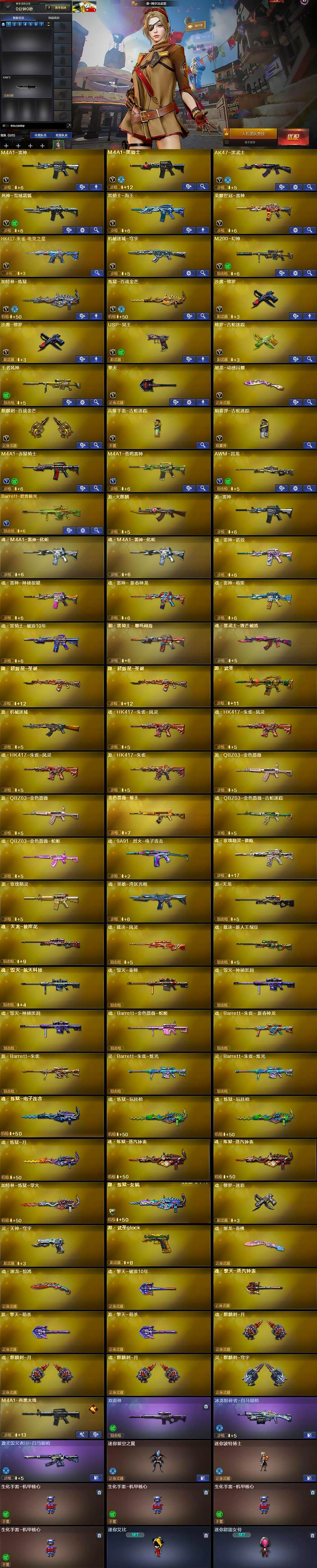 - [16910245]河北一区-99V-3王者武器数-0炫金武器数 【热门武器】:QBZ03-金色蔷薇*2,金色蔷薇-古蛇迷踪,修罗-古蛇迷踪,死亡之眼*4,Kar98K-星神,金色小号,C.A.T,牛牛-AK47,汤姆逊-烈龙*6,RPK-盘龙,加特林-炼狱*3,斯泰尔-蝴蝶,沙鹰-修罗*6 【王者炫金武器】:王者风神 【音效卡】:AK47-火麒麟音效卡,M4A1-雷神音效卡,M4A1-黑骑士音效卡,Barrett-毁灭音效卡,炼狱-百战金芒-庆典舞曲音效卡,死神-雪域霜狐-怀旧音效卡,AWM-昌龙-怀旧音效卡 【皮肤】:雷神-暗月,雷神-能量核心,雷神-星空,雷神-诺拉 皮肤,M4A1-再燃火线,火麒麟-雷神,毁灭-暗月,毁灭耀金皮肤,毁灭-星空,毁灭-魔灵皮肤,毁灭-虹光风暴 皮肤,黑龙-能量核心,黑龙-暗月,无影-暗月,无影-能量核心,无影耀金皮肤,死神-秘银,天启-暗月,战神-粉色甜心皮肤,战神-紫绶金章皮肤*4,战神-流金岁月皮肤*2,天龙-秘银,天龙-能量核心,AWM-天龙-传奇70KG,极光-能量核心,修罗-能量核心*2,屠龙-荣耀之锋,轻型军用手斧-再燃火线 【角色】:葵,魅影,炫,战地猎狐,雪域霜狐,蛇隐宗,空,芳心审判者,风暴女,疾风,娟娟,零-水下丽影,灵狐者-X,玫瑰花神,娜塔莉娅,潘多拉-甜心教官,蛇姬,斯沃特-X,蜀雪,铁骑荣耀,新娜塔莎,影武者-X,智影 【人偶武器】:斯泰尔-蝴蝶,M37-葵,COP-旗袍,C.A.T,牛牛-AK47,迷你生化手雷,生化手雷-机甲核心*3,闪光弹-小乔 【暴走生化】:死亡之眼*4 【挑战大师】:激光毁灭者III 【英雄级武器】:AK47-火麒麟*3,M4A1-黑龙,M4A1-雷神*3,AK47-无影,M4A1-死神,AK47-黑武士,AK12-天启,AN94-超新星,M4A1-武圣,AK47-黑鲨*2,M4A1-龙血*2,M4A1-雷霆,金色蔷薇-古蛇迷踪,死神-雪域霜狐,M4A1-玫瑰精灵,QBZ03-金色蔷薇*2,王者之幻-觉醒版,AK-47-猩红传说*5,AK47-B-战神,AWM-天龙,Barrett-毁灭*2,Barrett-极光,AWM-裁决,Kar98K-星神,Barrett-金色蔷薇,RPK-盘龙,加特林-炼狱*3,炼狱-百战金芒,汤姆逊-烈龙*6,AA-12-雷霆,沙鹰-修罗*6,沙鹰-天神,COP-雷