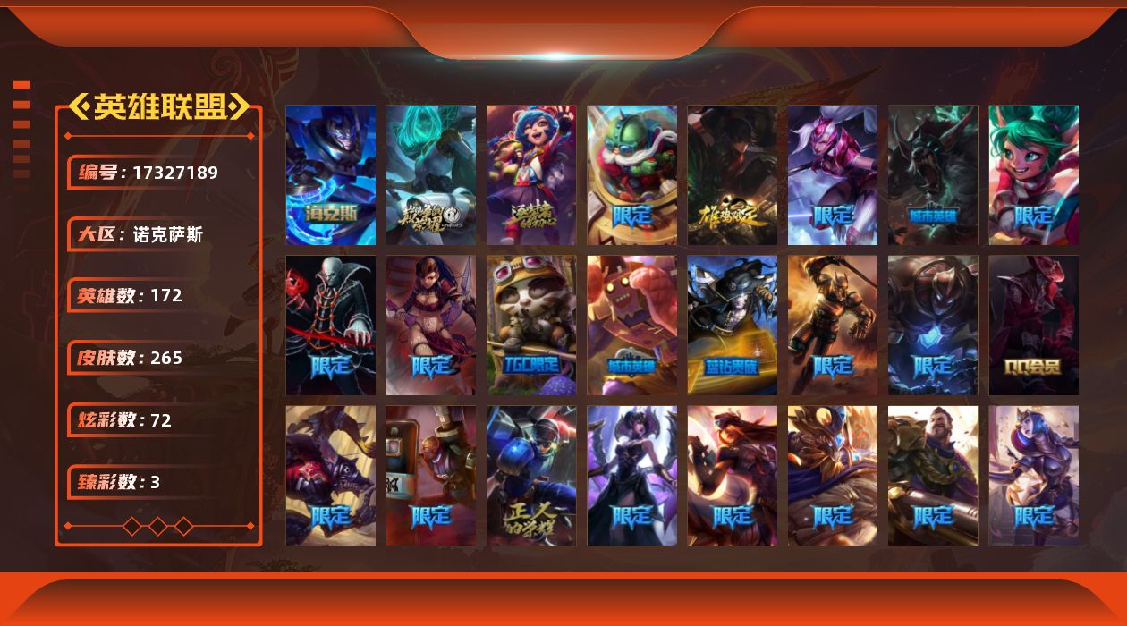 [17327189]铂金段位-172英雄-265皮肤-72炫彩-0终极-4神话-44限定-19传说-65史诗