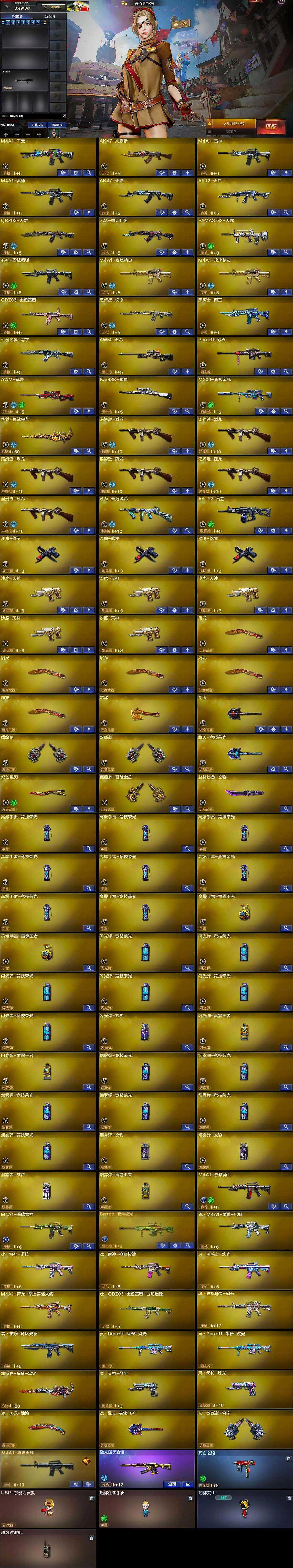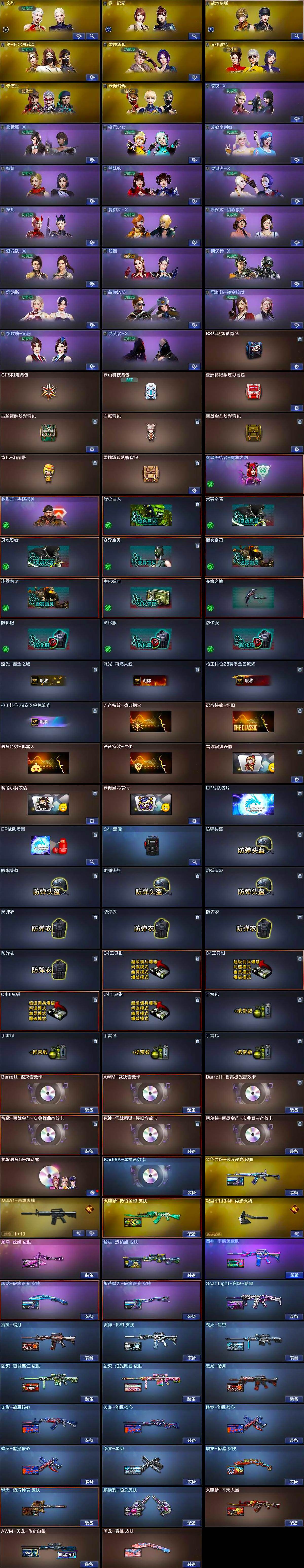【英雄级武器】:M4A1-千变,AK47-火麒麟,M4A1-雷神*2,AK47-无影,AK12-天启,QBZ03-天罚,无影-神兵利器,FAMAS G2-天戎,死神-雪域霜狐,M4A1-玫瑰精灵*2,QBZ03-金色蔷薇,超新星-悦享-觉醒版,黑骑士-海王,加利尔ACE-天袭,HK417-朱雀-电竞之星,机械迷城-穹宇,AWM-天龙,Barrett-毁灭,AWM-裁决,Kar98K-星神,M200-竞技荣光,炼狱-百战金芒,汤姆逊-烈龙*6,烈龙-云海游龙,AA-12-雷霆,沙鹰-修罗*3